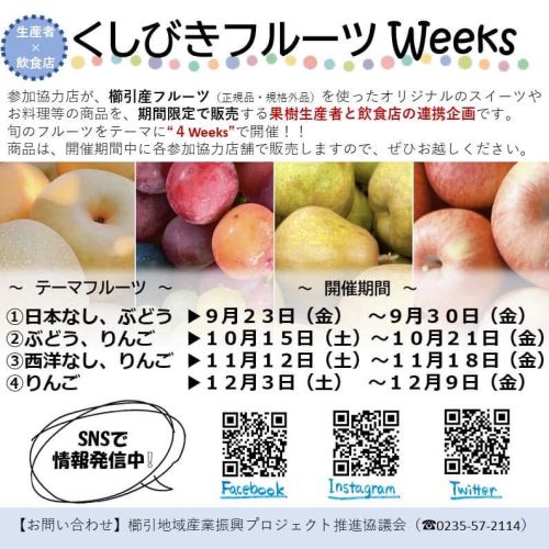 櫛引地域産業振興プロジェクト推進協議会(事務局:櫛引庁舎産業建設課)では、櫛引地域果樹生産者と市内飲食店等の連携企画として「くしびきフルーツWeeks」を実施します。