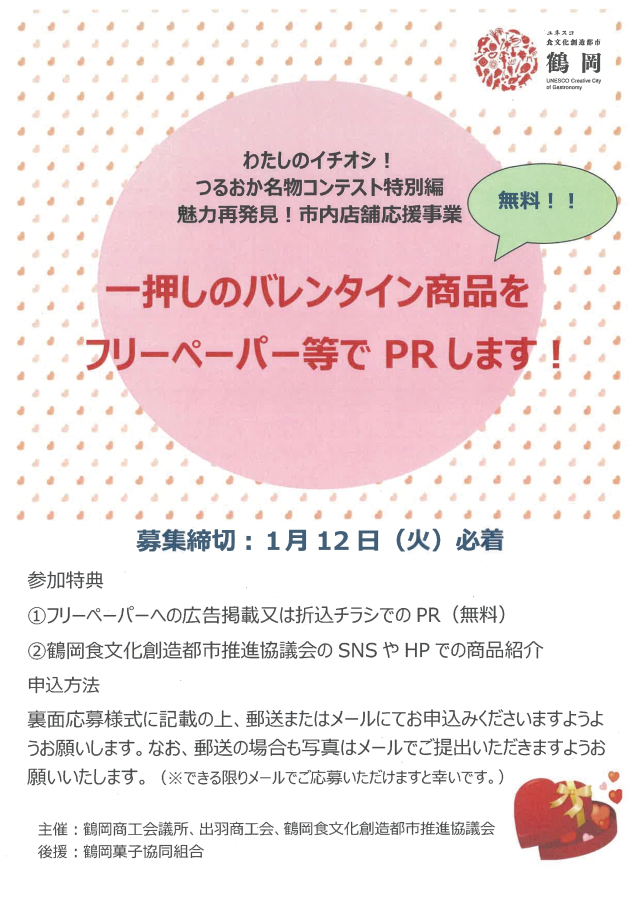 鶴岡食文化創造都市推進協議会、鶴岡商工会議所、出羽商工会では、食文化の一役を担う菓子事業者・商品を広く周知し、市民に地元のおいしい食を再発見してもらい、市内の消費拡大につなげることを目的として、「わたしのイチオシ!つるおか名物コンテスト特別編 魅力再発見!市内店舗応援事業」を実施いたします。