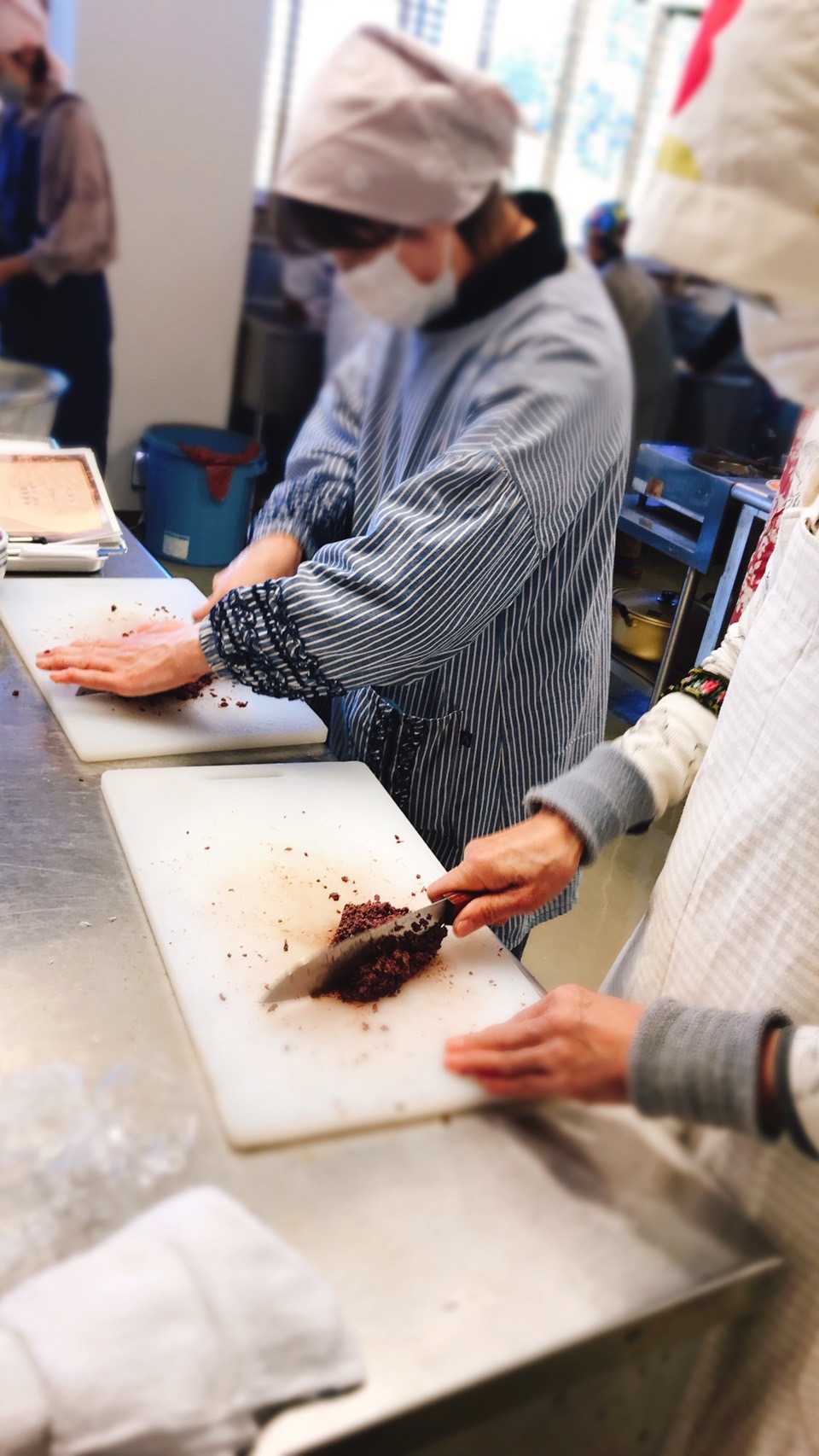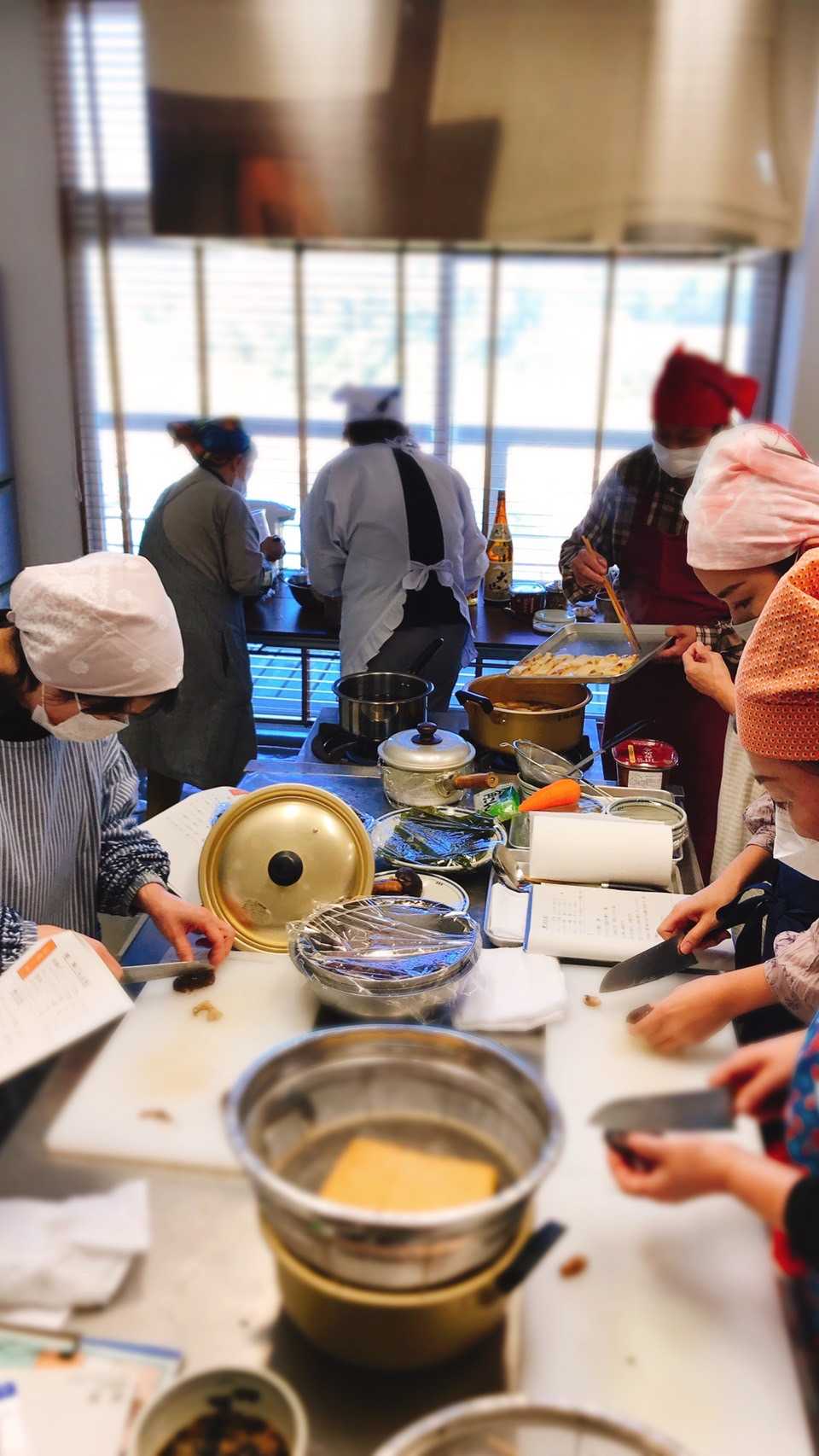 今回は、黒川能保存会 秋山かおる氏と、黒川能の里の会 小関やゑ子氏を講師にお迎えし、酒井家庄内入部400年を記念して、酒井家とゆかりのある黒川能の行事食を一緒に作りました。「当屋豆腐」と「きりあえ」は、2月1日と2日に渡って行われる王祇祭の期間中しか食べられる機会もないため、料理講座後のアンケートでは「文化を感じながら楽しむことが出来た。」「食事の面から文化を学べて、貴重な体験が出来た。」などの感想・ご意見をいただきました。