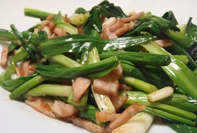 多文さんのおすすめは、ベーコンとの炒めたもの。行者ニンニク独特の香りが引き立ち食欲がそそります。他に生のままで味噌マヨネーズをつけて食べるのもおいしいそうですよ。