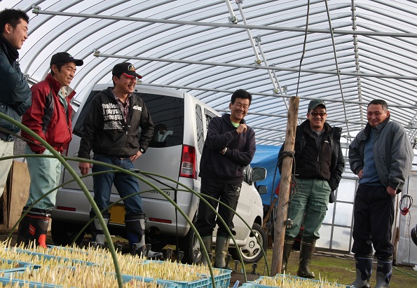 メンバーの皆さんは、ハウス内や冷蔵庫、行者ニンニクを丹念に見ながら、質問が飛び交い、圃場主は丁寧に答えていきます。より品質の良いものを栽培するため、部会のメンバーで栽培技術を共有します。皆さんこの後の反省会を兼ねた新年会も楽しみにされているようで、終始なごやかでした。