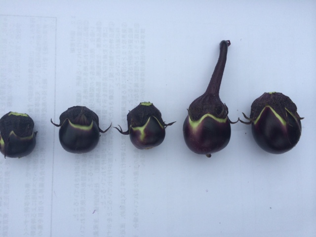 民田なすは、長さ3〜4センチ、15グラムほどの小さなものです。写真の右から二つは規格外の大きさとなってしまうとか。