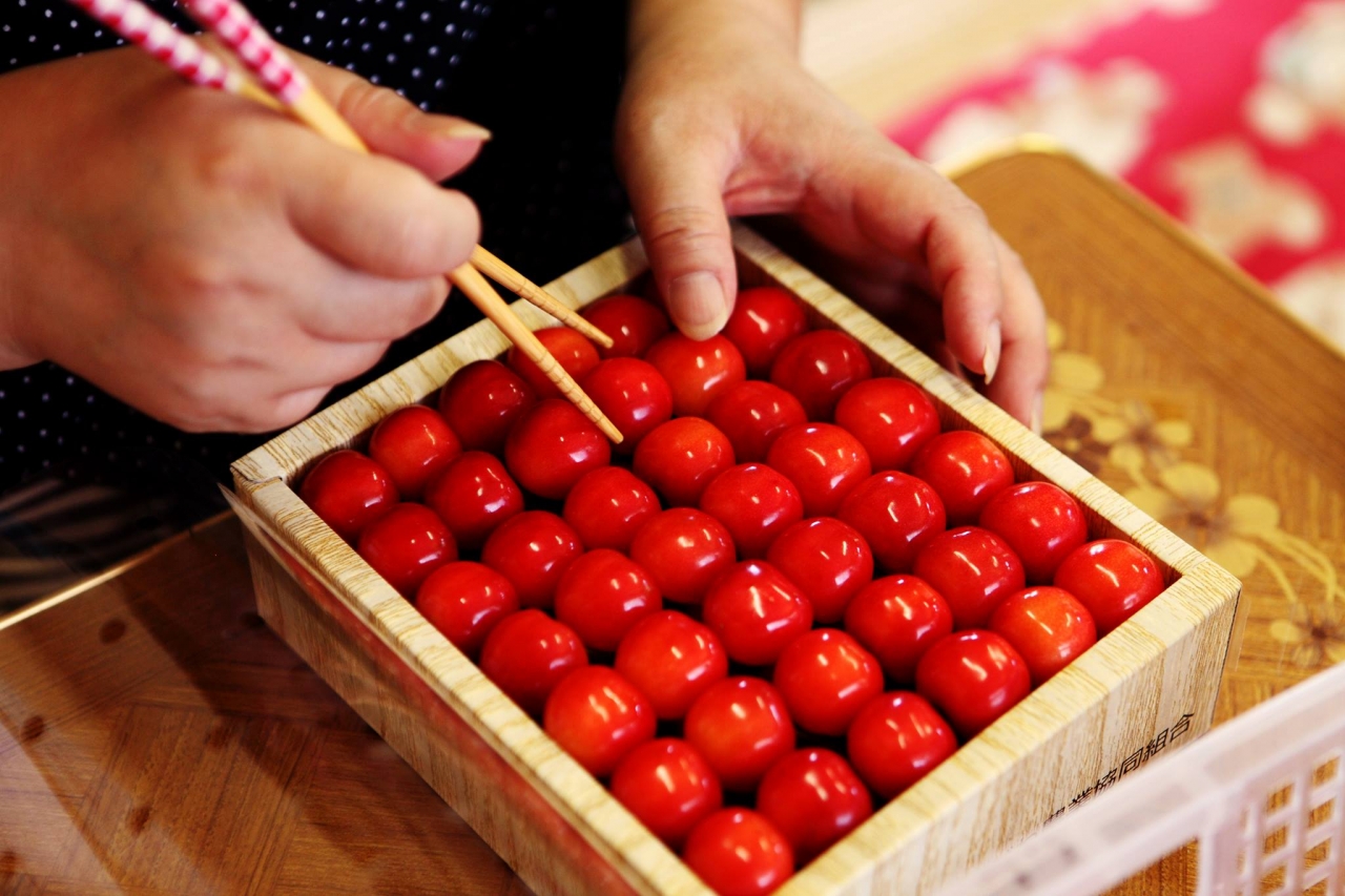 鈴木さくらんぼ園の入口のさくらんぼの木をくぐると、奥の部屋では、たくさんの女性たちがさくらんぼを丁寧に一つずつサイズを測りながら選別、箱詰めをしています。この日も、さくらんぼ農園では日の出から多くの人が収穫のために動き出していたそうです。