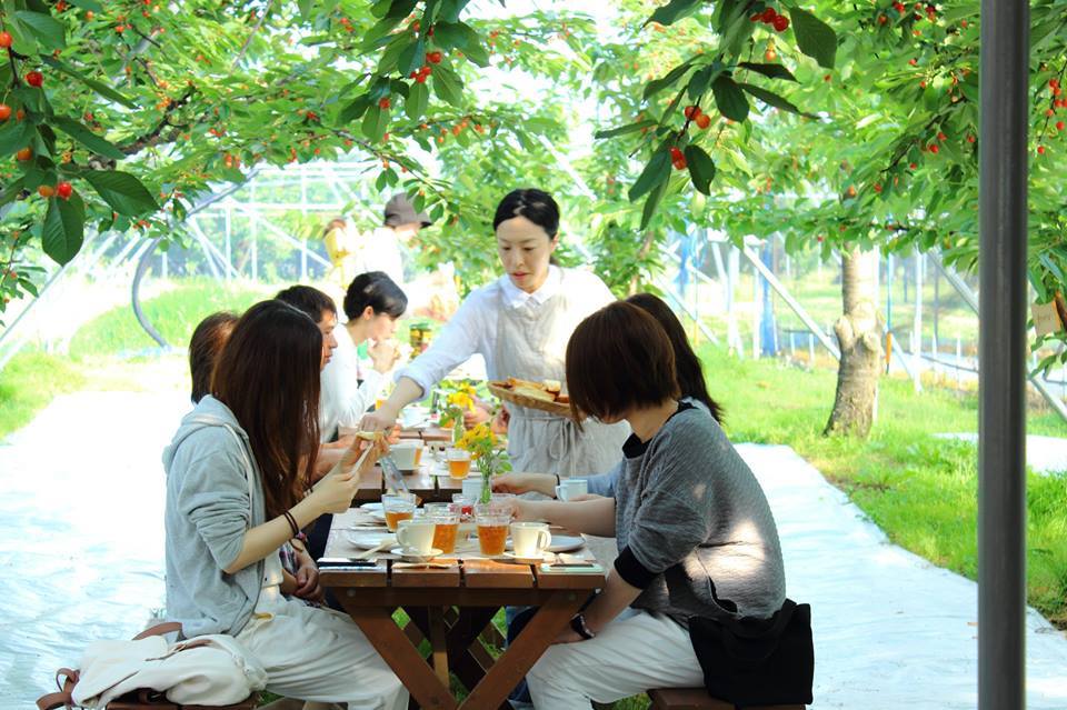 さくらんぼの時期は、6月初旬から7月初旬頃。宮城さんご夫妻が鈴木さくらんぼ園に関わるようになってから、少しずつ新しいチャレンジもしています。たとえば、2014年からスタートした「朝摘みさくらんぼ×朝カフェ」。早朝涼しい時間帯は木の呼吸が減り、栄養分が実に蓄えられ粒が大きくなり、甘味も増します。気温が上がる前のパリッとした食感が1番美味しい時間帯。朝6時半にさくらんぼ園に集まり、涼しいうちにさくらんぼを摘み取り体験をします。その後、朝カフェとして地元のお店の淹れたてコーヒーや、軽食を楽しむことができるプログラムです。