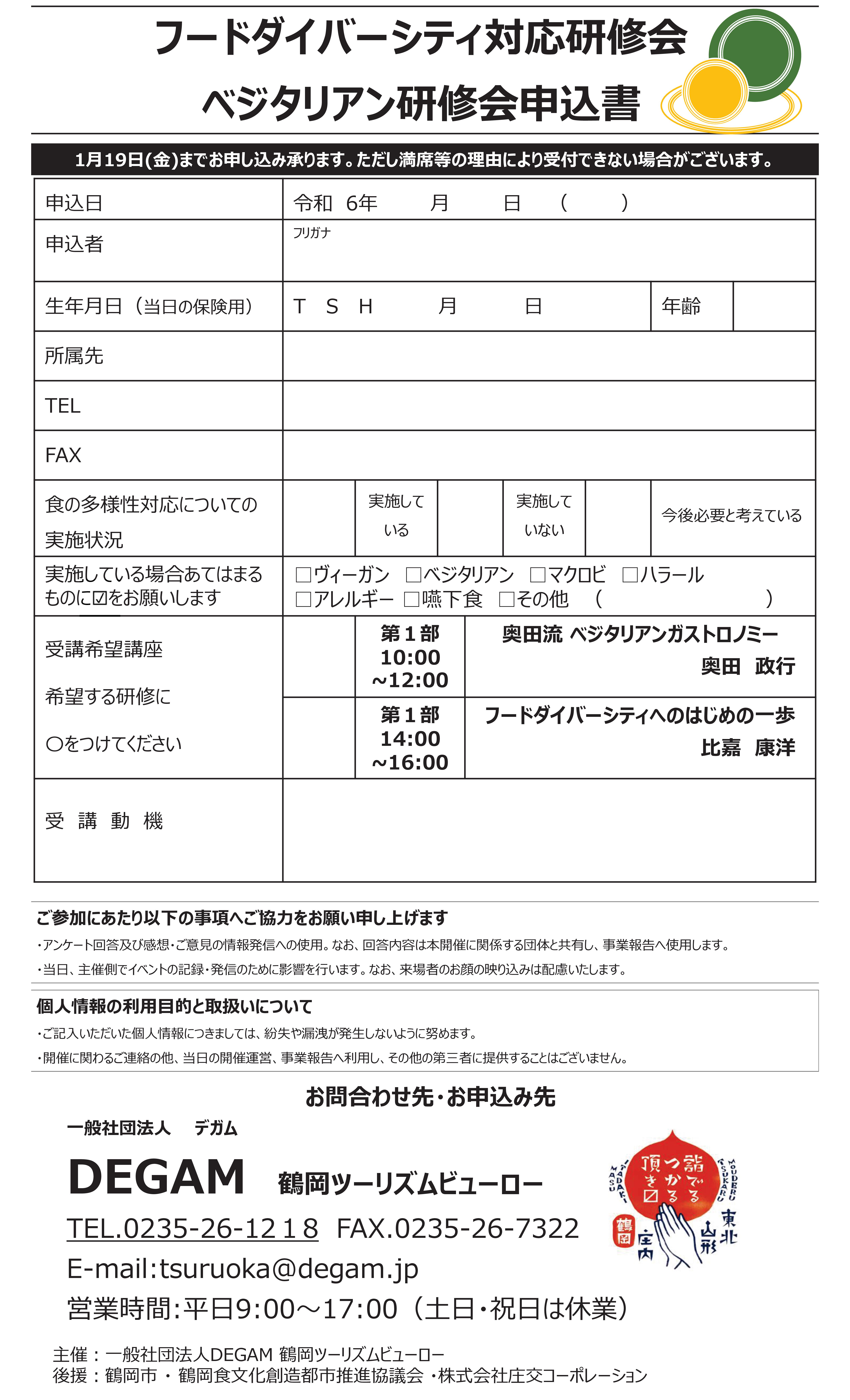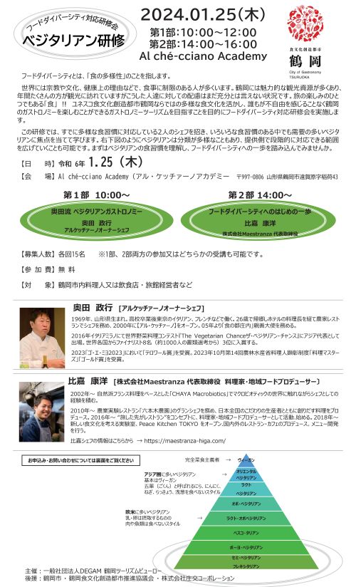 ユネスコ食文化創造都市鶴岡ならではの多様な食文化を活かし 、 誰もが不自由を感じることなく鶴岡のガストロノミーを楽しむことができるガストロノミーツーリズムを目指すことを目的 にフードダイバーシティ 対応研修会を実施します 。