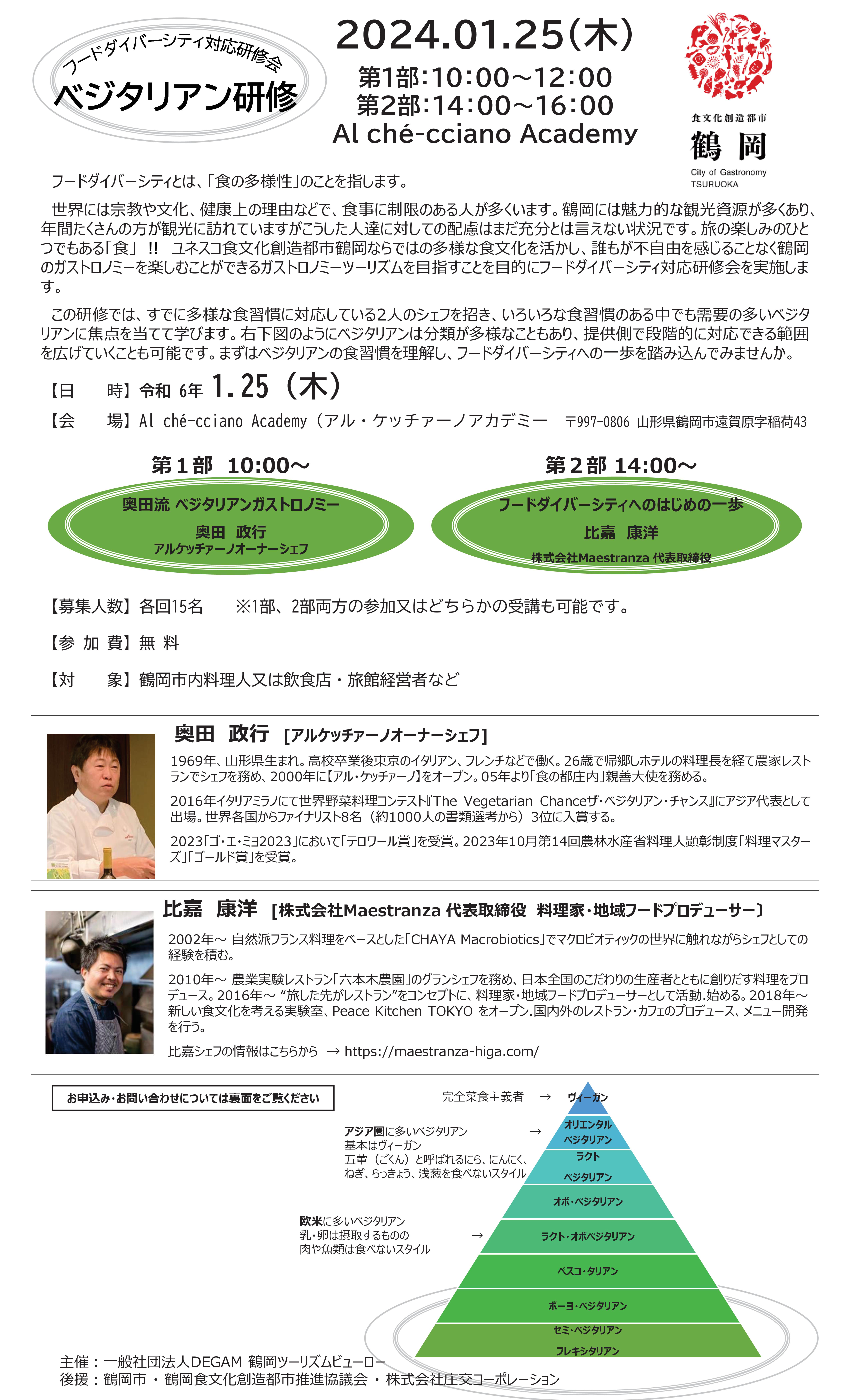 ユネスコ食文化創造都市鶴岡ならではの多様な食文化を活かし 、 誰もが不自由を感じることなく鶴岡のガストロノミーを楽しむことができるガストロノミーツーリズムを目指すことを目的 にフードダイバーシティ 対応研修会を実施します 。
