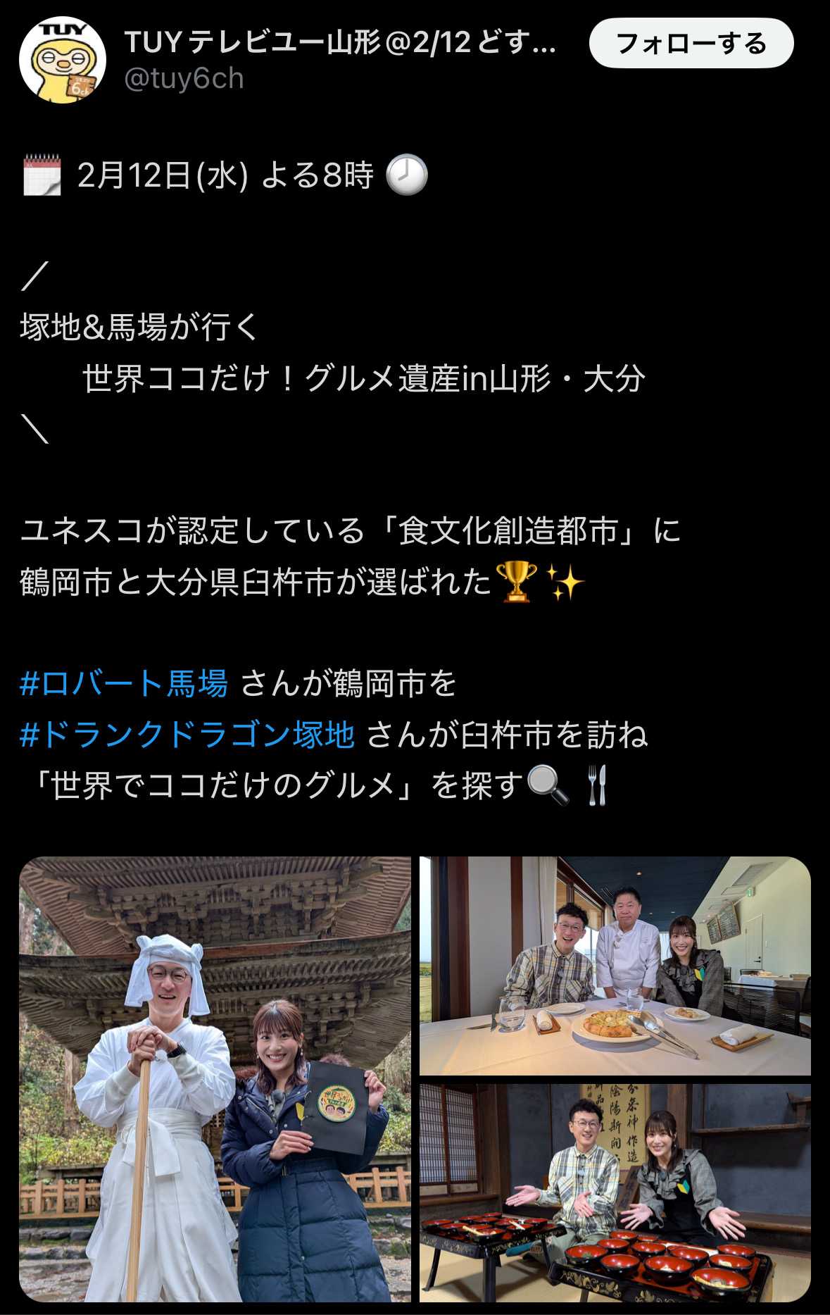 TUYテレビユー山形@2/12どすコイ&世界ココだけグルメ遺産
