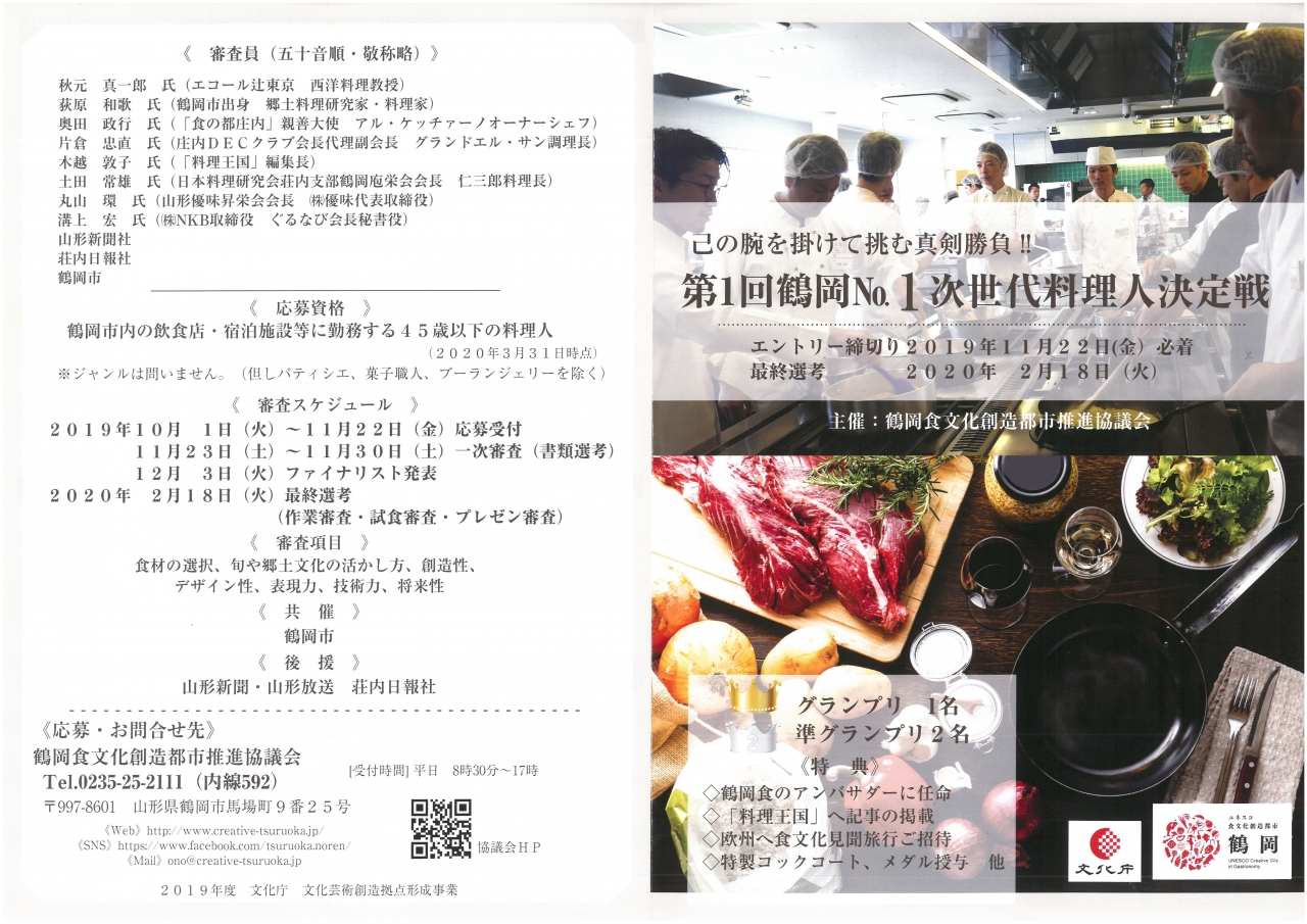 鶴岡市では地元料理人の育成を目的にこれまで講座の開催、自己研鑽に対する支援などに取り組んでまいりました。今回は、「鶴岡の食」を全国に向けて発信できる次世代リーダーを輩出するため「第1回鶴岡№1料理人決定戦」を開催致します。鶴岡市の料理人の皆さん!奮って挑戦してください!