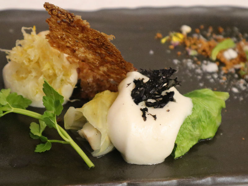 鶴岡の冬の風物詩である寒鱈を見た目も華やかに再構築した一品。和食のイメージを飛び越えてフレンチの技術・考え方を見事に応用しているのが素晴らしかったです。