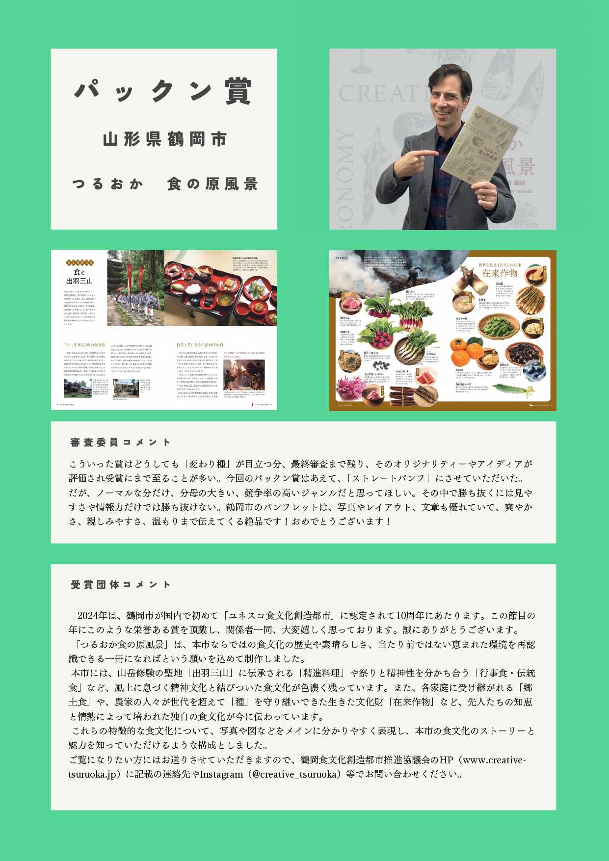 (一財)地域活性化センターが主催する「ふるさとパンフレット大賞(第12回)」において、鶴岡食文化創造都市推進協議会で作成したパンフレット『つるおか食の原風景』が下記のとおり「パックン賞」を受賞しました!