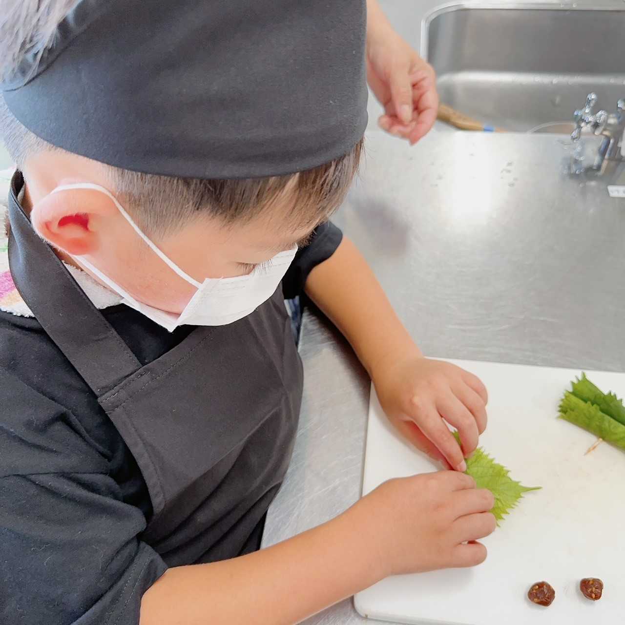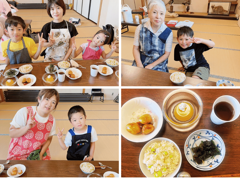 調理「ごはんを作ろう」では、食生活改善推進協議会 藤島地域の皆さんを講師に迎え、①枝豆ごはん、②小芋の煮っころがし、③しそ巻き、④果汁ゼリーを作り、参加者、講師、スタッフ全員で美味しくいただきました。