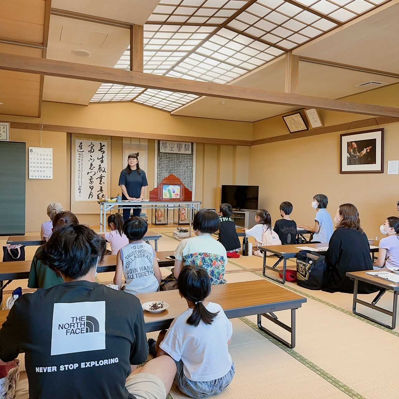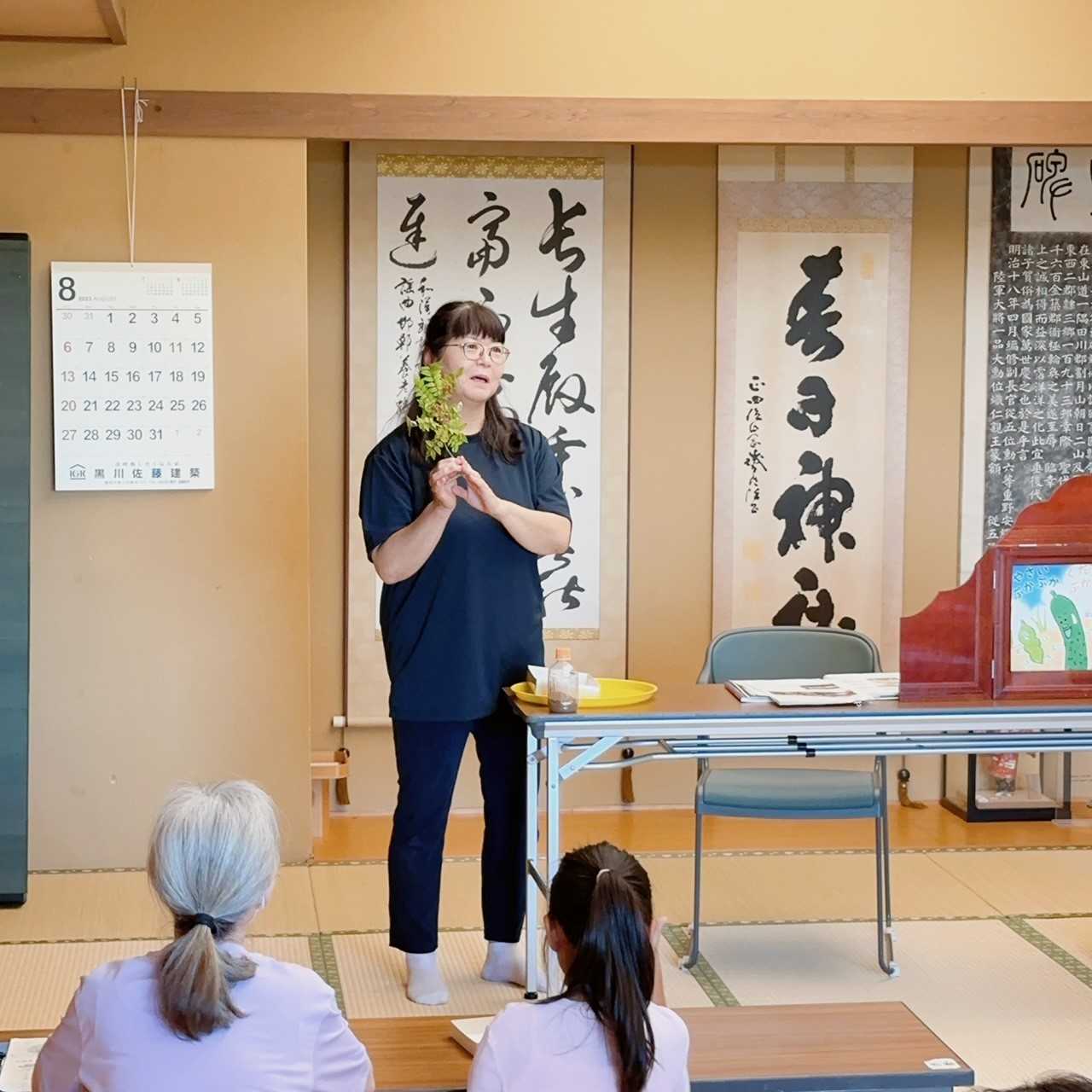座学「郷土を知ろう」では、鶴岡ふうどガイドの秋山かおるさんが講師を務め、黒川産の山椒や、夏野菜についての紙芝居「やさいぷかぷか、くだものぷかぷか」を上演いただきながら、食について学びました。