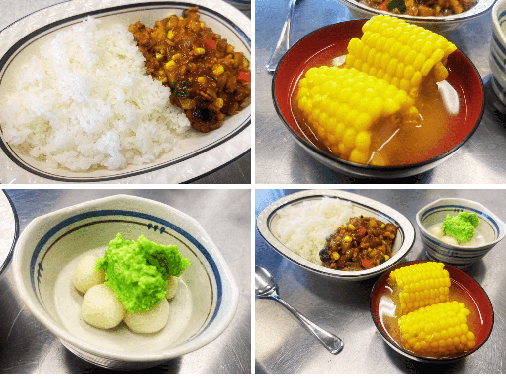 調理「ごはんを作ろう」では、食生活改善推進協議会 櫛引地域の皆さんを講師に迎え、①夏野菜のドライカレー、②とうもろこしの味噌汁、③ずんだ白玉を作り、美味しくいただきました。