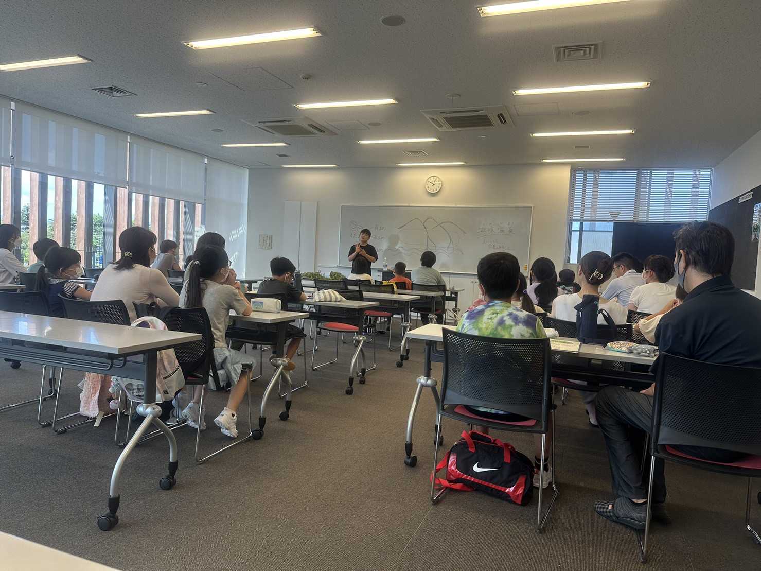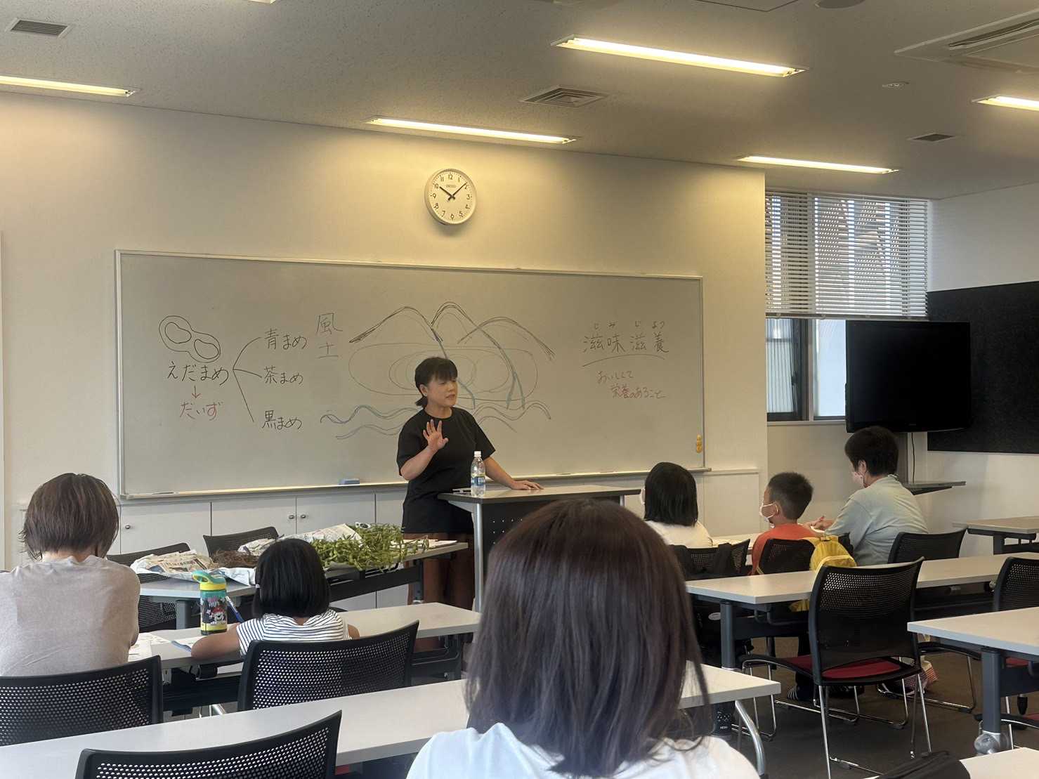 座学「郷土を知ろう」では、鶴岡ふうどガイドの中野律さんに、鶴岡地域の食文化について教えていただきました。鶴岡地域といえばやはりだだちゃ豆。クイズやホワイトボードに絵を描いての説明に、参加者は驚いたり、うんうんとうなずいたりしていました。