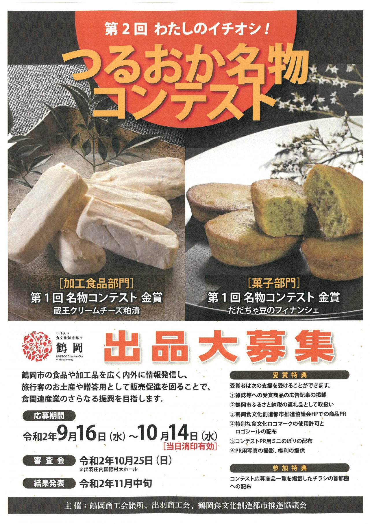 鶴岡のおいしい菓子や加工品を発掘し、その魅力を市内外に広く情報発信するため、一昨年度に引き続いて「わたしのイチオシ!つるおか名物コンテスト」を開催します。