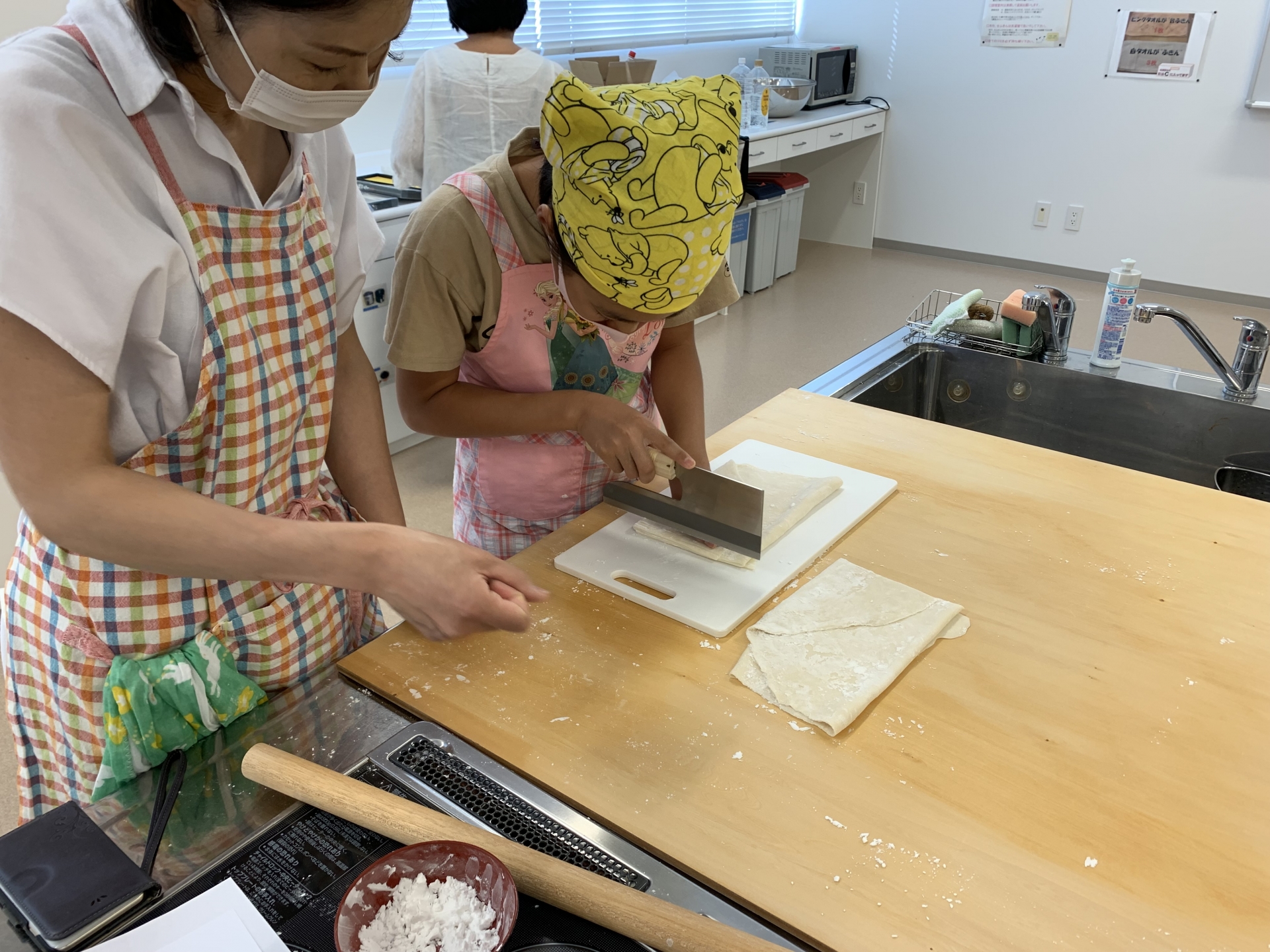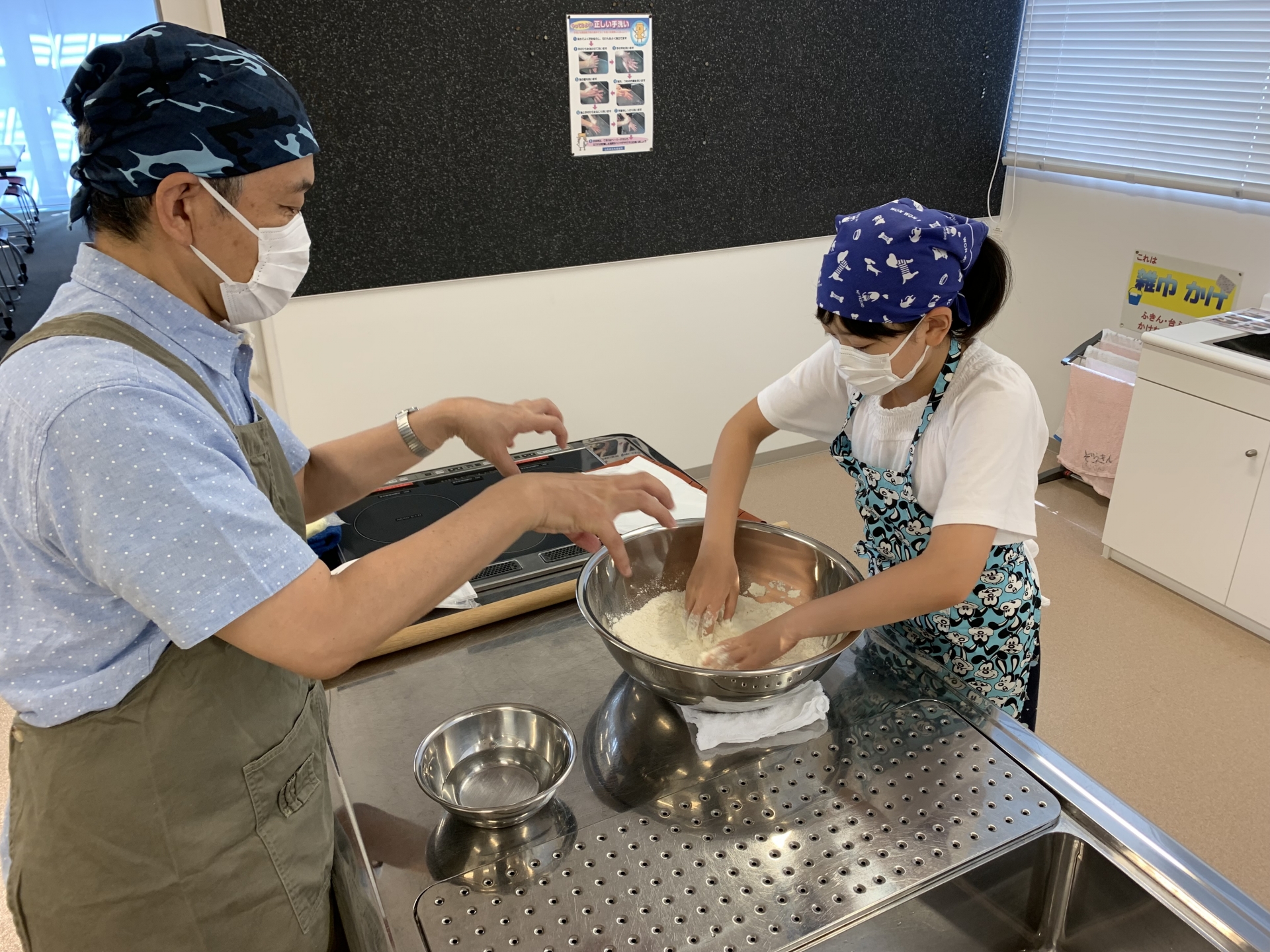 市内製麺業者の方に教わりながら、鶴岡の郷土料理「麦きり」の麺づくりを体験しました。原料の小麦粉は「庄内スマート・テロワール産小麦」でつくられた小麦粉を100%使用しているため、弾力の強い麺に仕上がったようです。子どもたちは初めての生地練り、麺切りに苦戦しながらも、保護者の方と力を合わせてやり遂げることができました。麺の生地を寝かせている間に、山形大学の先生より「スマート・テロワール」についての講話、市内野菜農家の方より農業に関する講話を聴きました。少し難しい内容ながらも、クイズを交えたお話に真剣に聞き入っていました。(R3.7.25実施)
