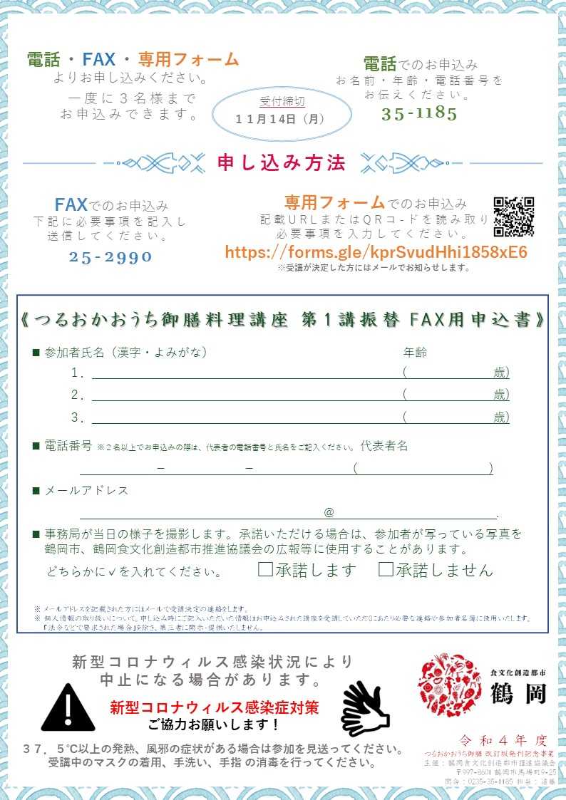 《 つるおかおうち御膳 料理講座 第1講振替 申込専用フォーム 》