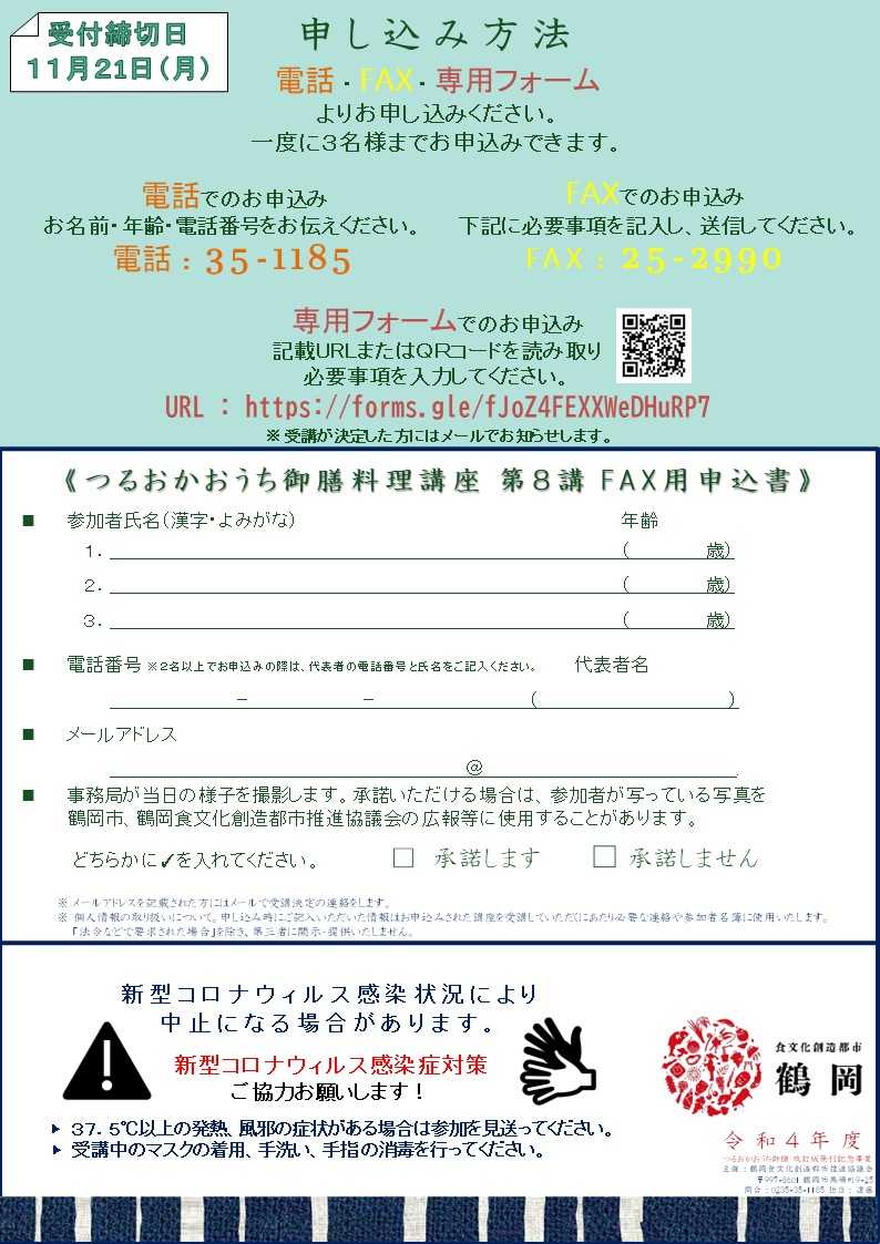 《 つるおかおうち御膳 料理講座 第8講 申込専用フォーム 》