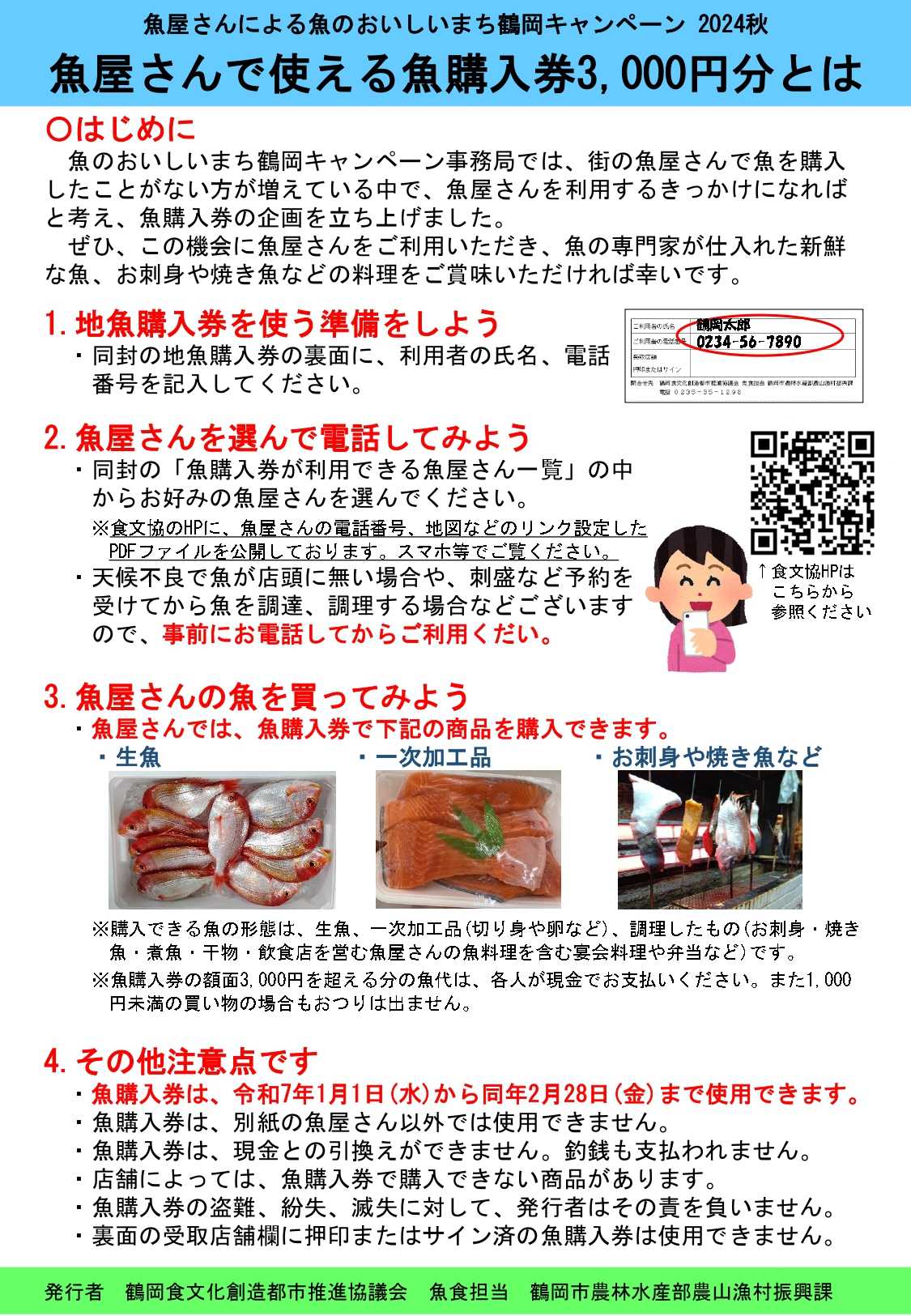 魚購入券の使用期限は令和7年2月28日(金)までとなっておりますので、ぜひ市内の魚屋さんに足を運んで美味しい魚を食べて、庄内浜産魚介の消費拡大へのご協力をお願いします。