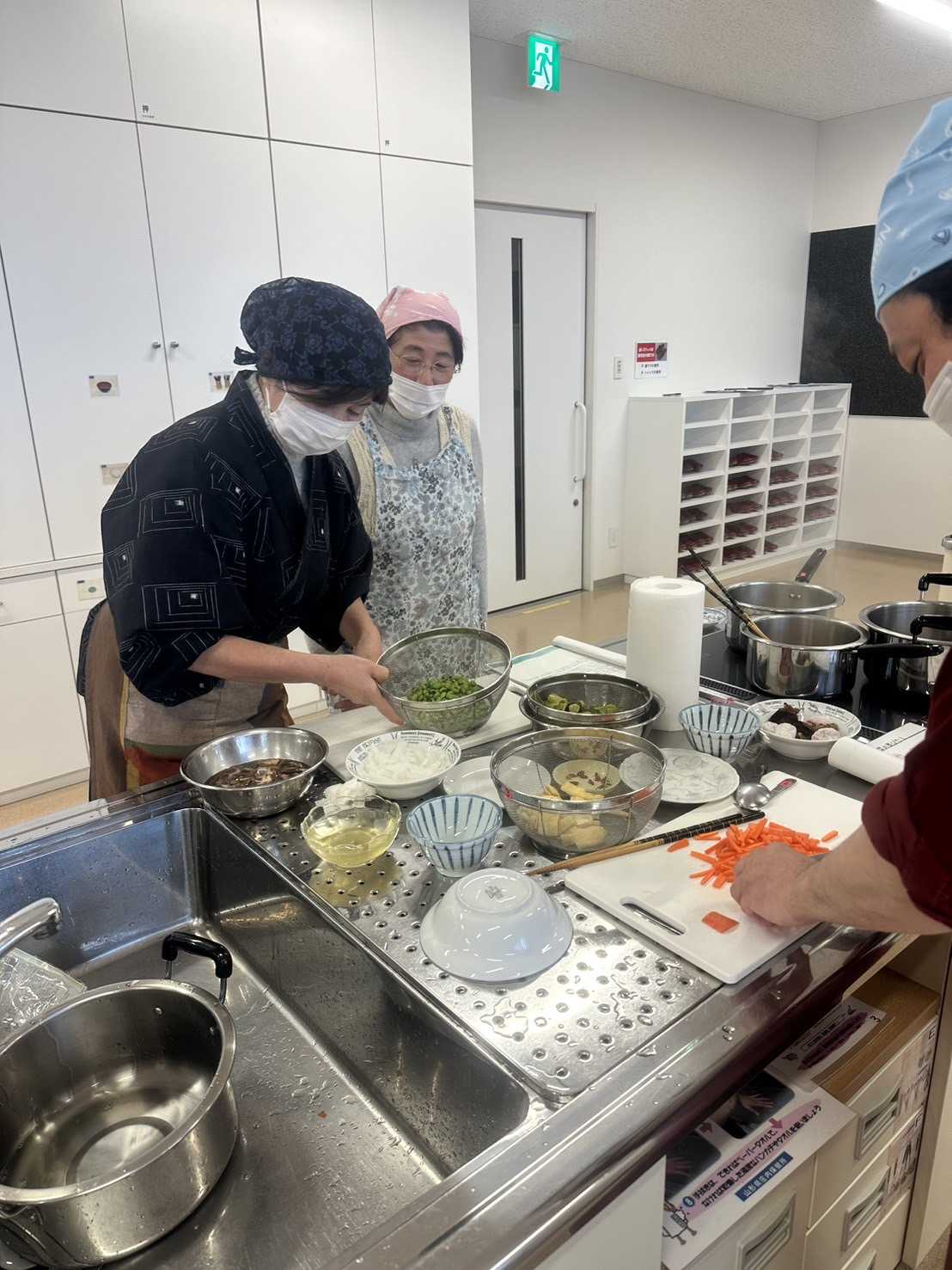 今回は、食生活改善推進協議会 藤島地域の皆さんを講師に迎え、芋がら入り五目ご飯、青菜の煮びたし、古漬けたくあんと菊の甘酢和え、干し柿の天ぷらを作りました。