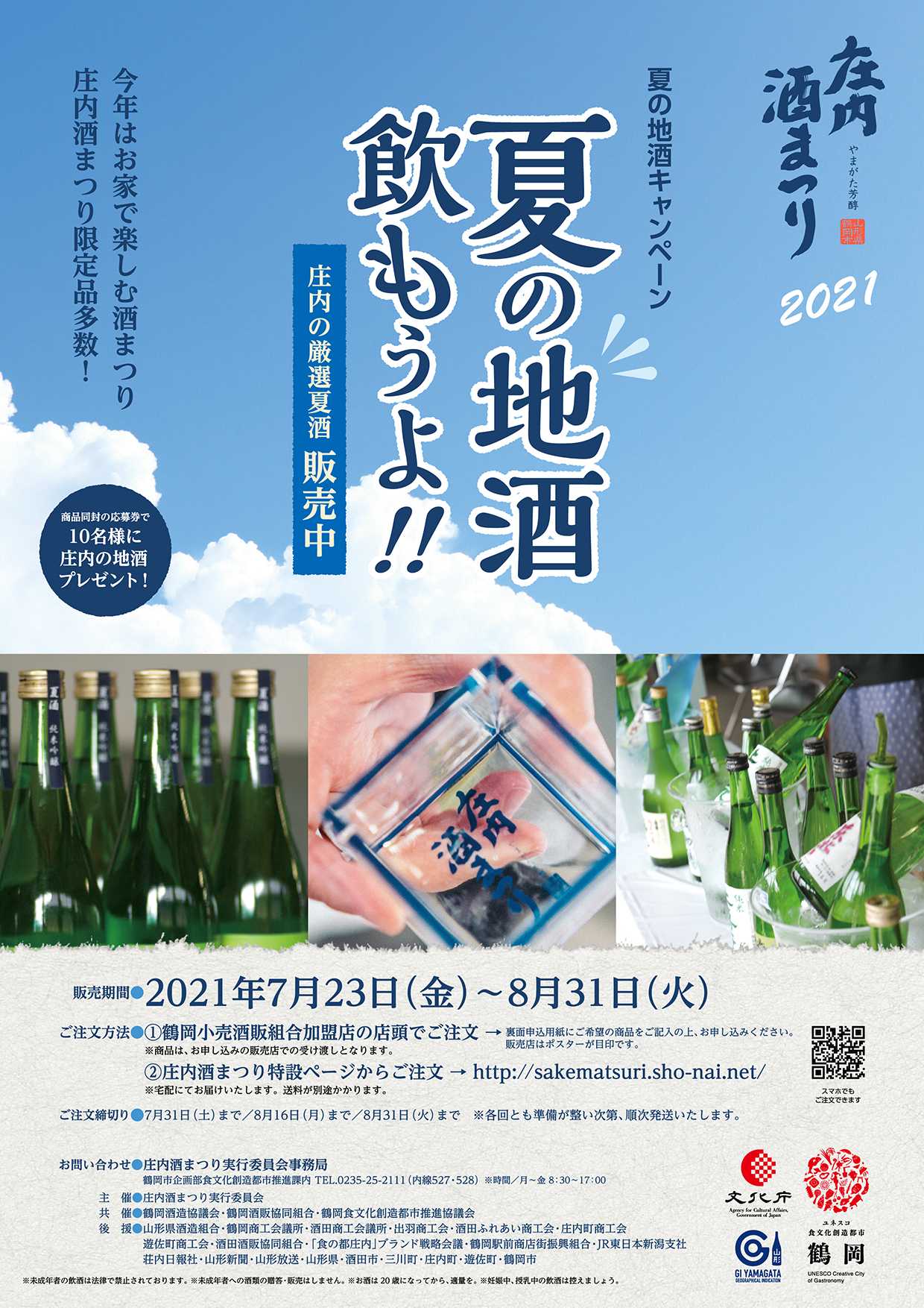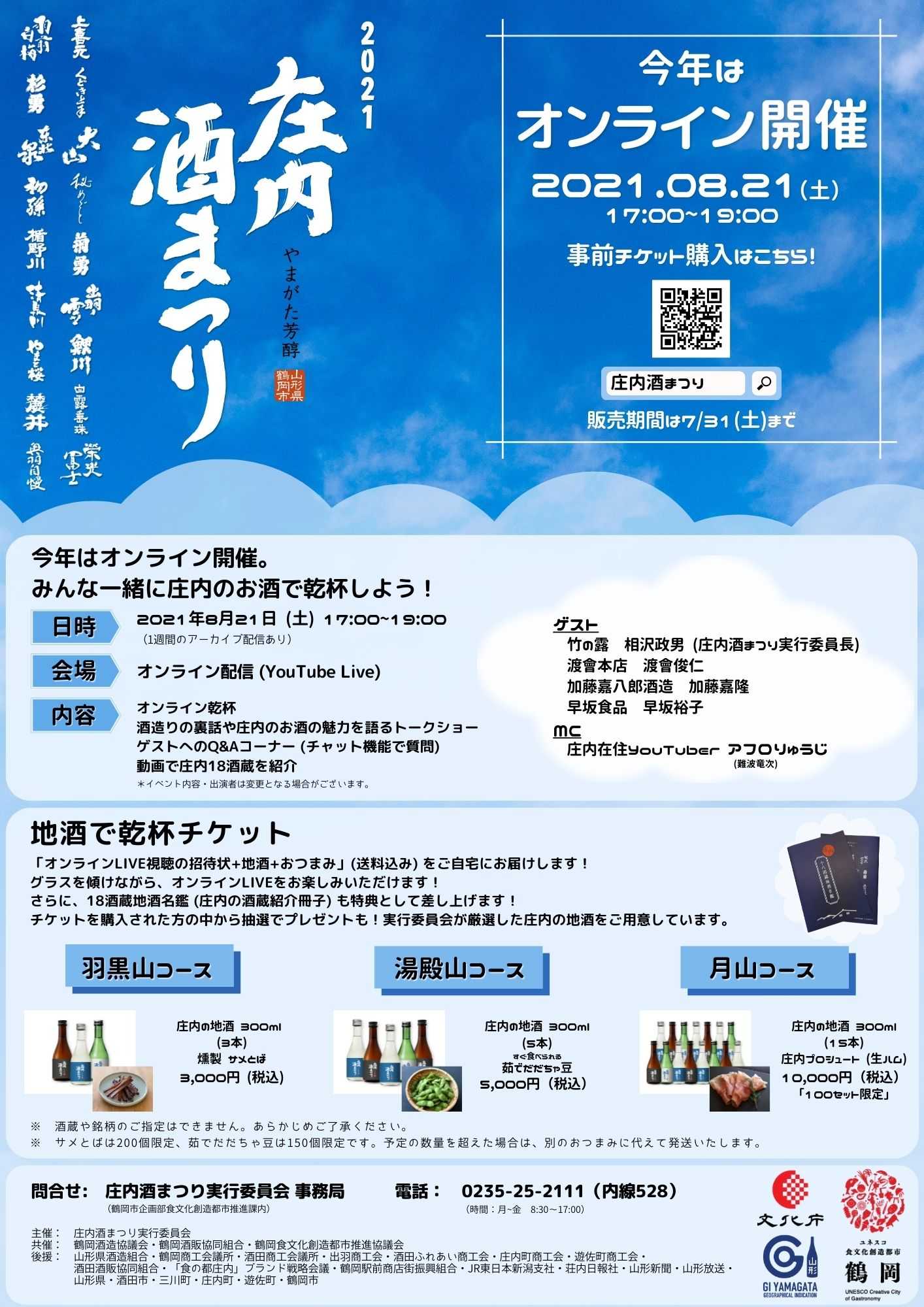 庄内酒まつりは、コロナ禍により、昨年度(R2)は中止となりましたが、今年度(R3)「庄内酒まつり2021~やまがた芳醇~」は2年ぶりに開催、①オンラインイベントと②庄内の厳選夏酒販売を行います。