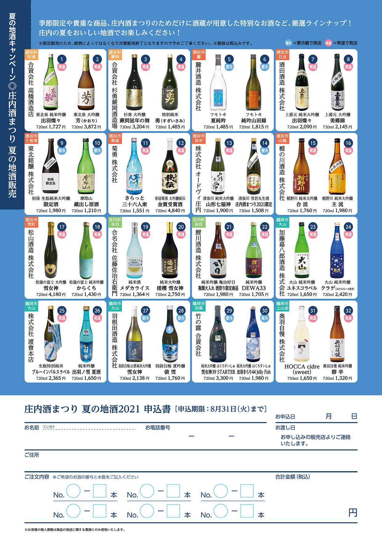 | 後 援 | 山形県酒造組合・鶴岡商工会議所・酒田商工会議所・出羽商工会・酒田ふれあい商工会・庄内町商工会・遊佐町商工会・酒田酒販協同組合・「食の都庄内」ブランド戦略会議・鶴岡駅前商店街振興組合・JR東日本新潟支社・荘内日報社・山形新聞・山形放送・山形県・酒田市・三川町・庄内町・遊佐町・鶴岡市 |
