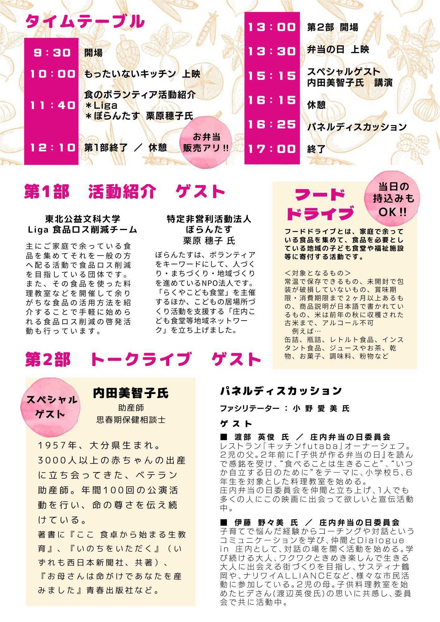 今年で第7回目となる「おいしい鶴岡 食の映画祭」。第一部には “もったいないキッチン”、第二部には “弁当の日” を上映。 また、当日は、もったいないロスをなくそう!ということで、まだ食べられるけど消費しきれない食品を持ち寄る取り組み、フードドライブも行います。