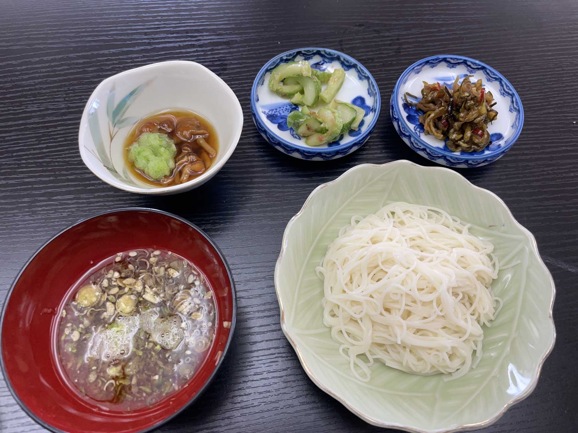 ・つけ汁(おろしきゅうり、みょうが、ねぎ)
