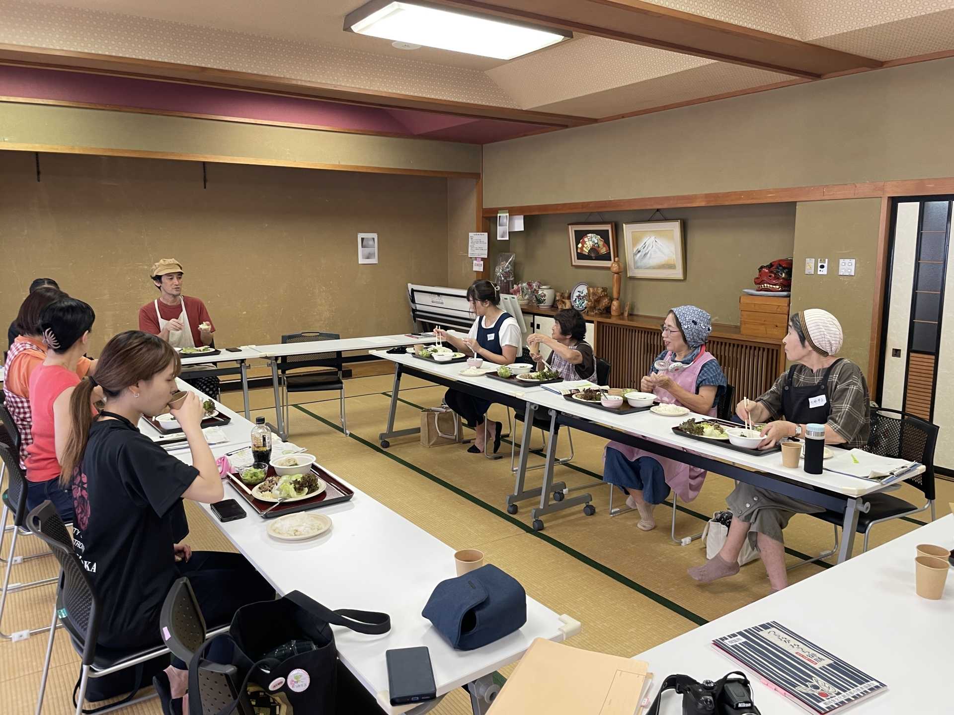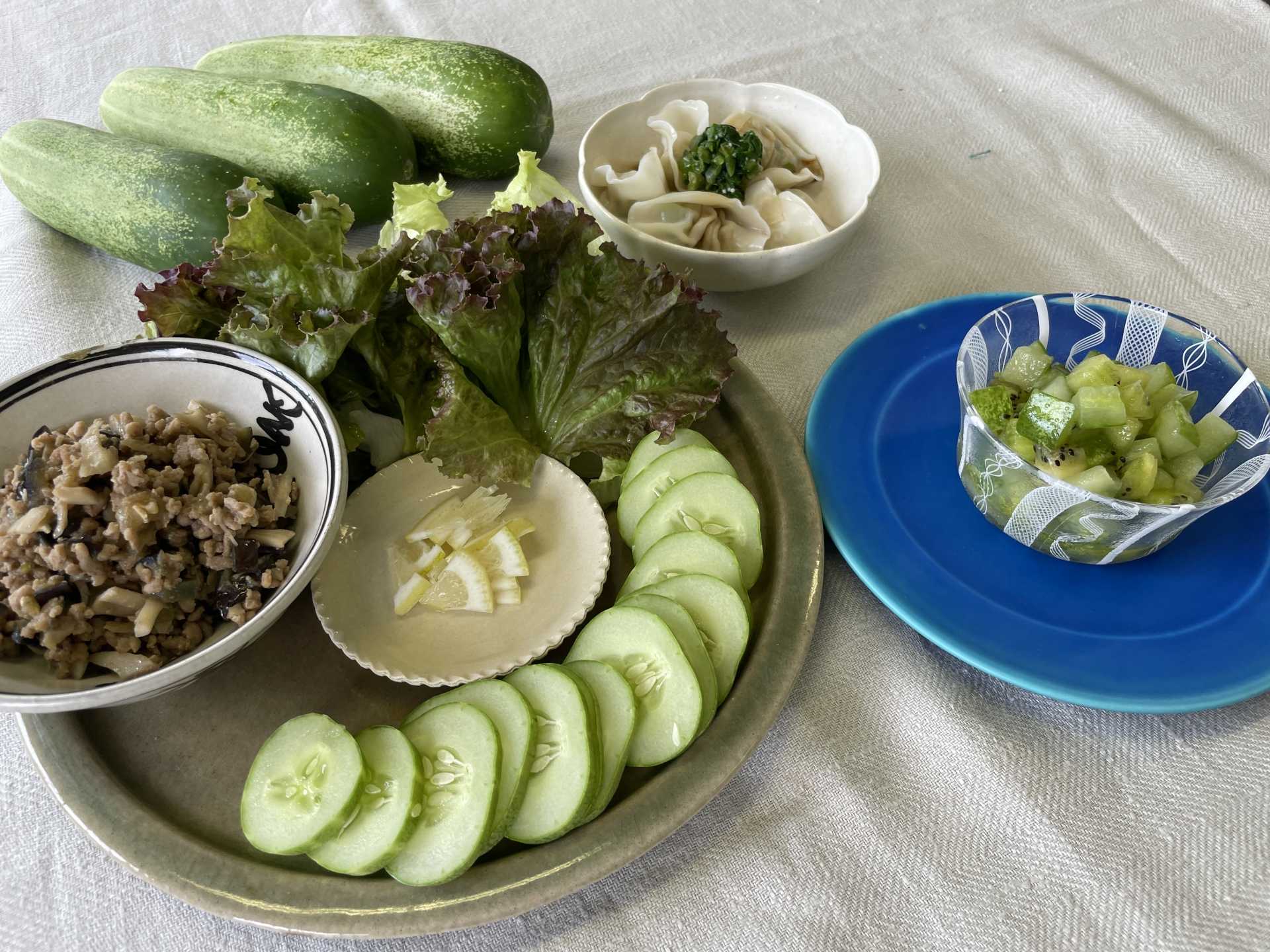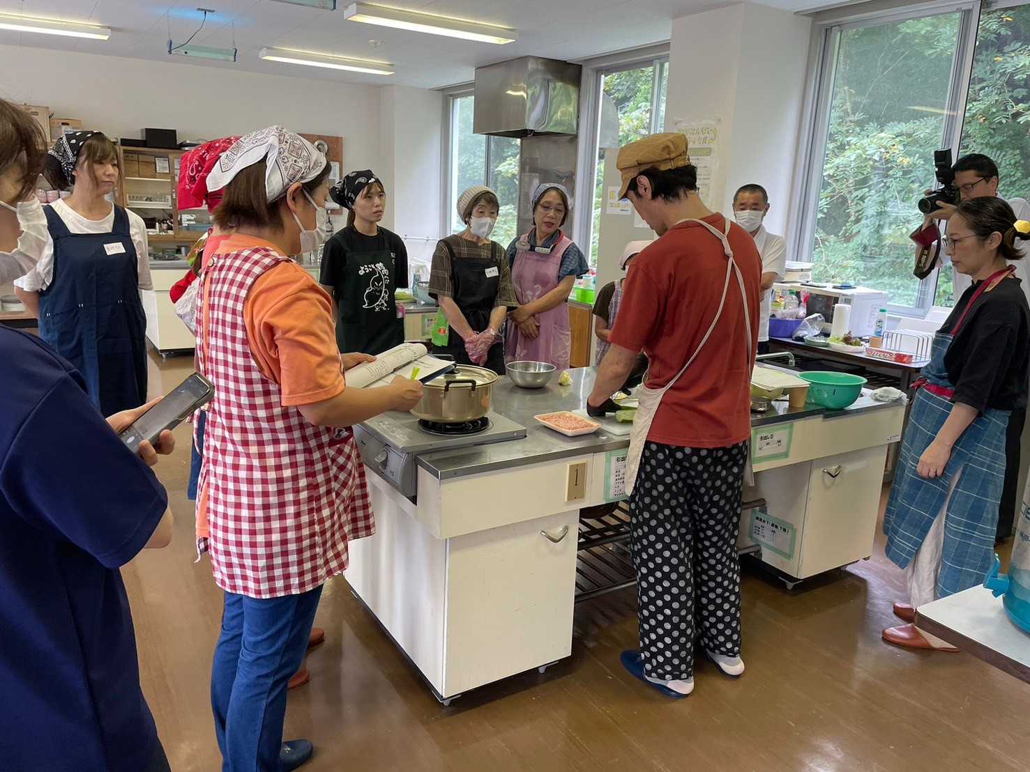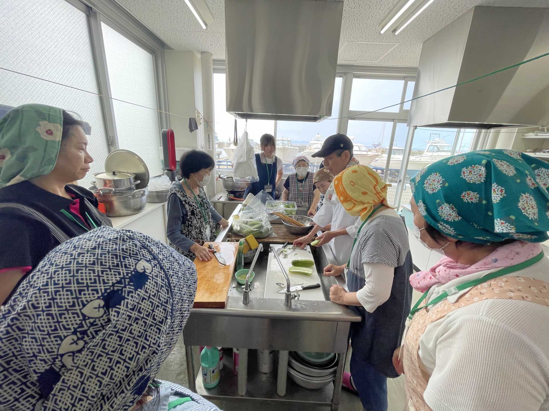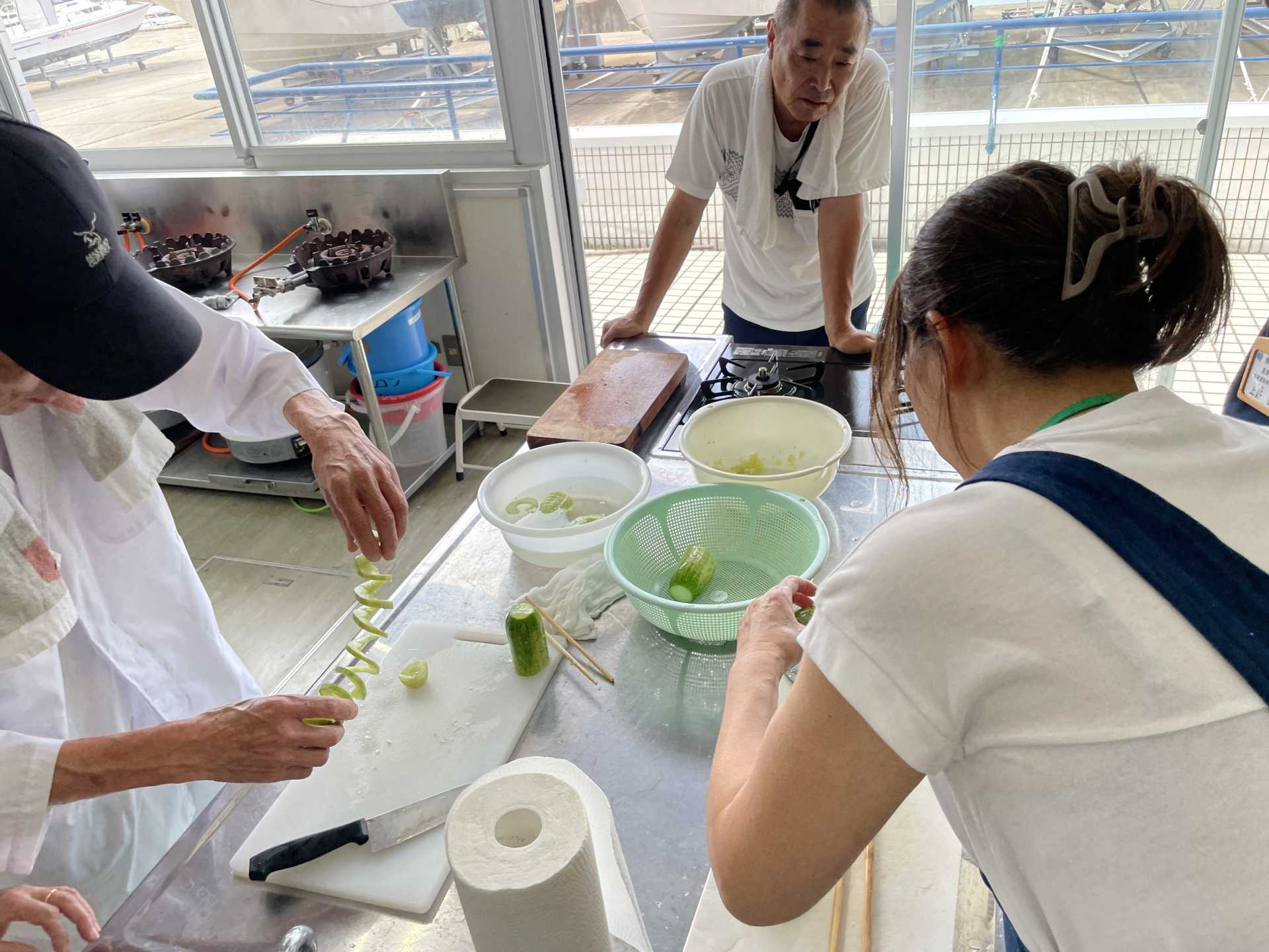 1回目の20日(火)は、海に面したお部屋と美味しい海鮮料理が人気の「民宿咲」を営んでいる、佐藤具視さんを講師に迎え、與治兵衛きゅうりの佃煮や、おろしきゅうりなめこなど合計6品を調理しました。