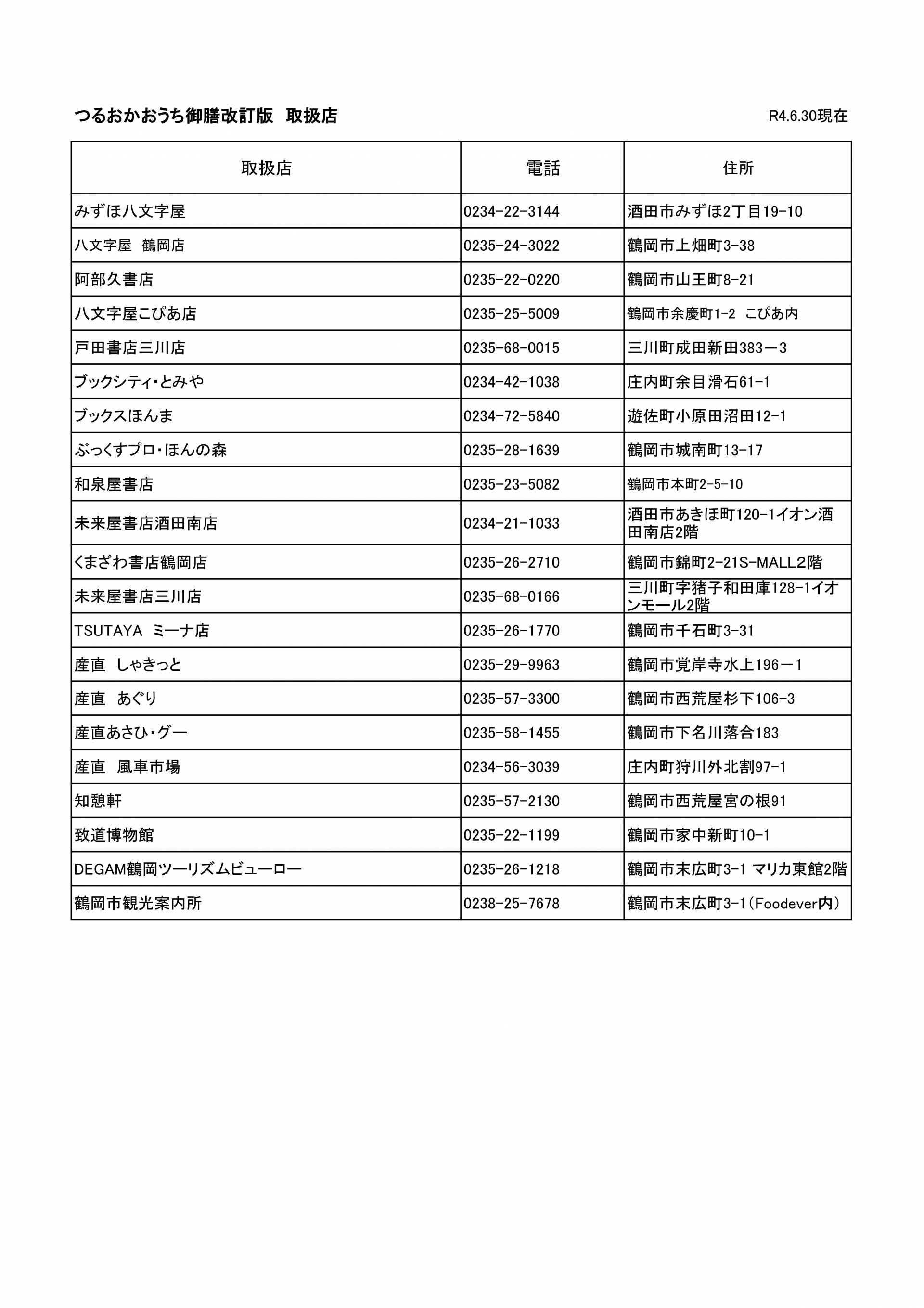 『つるおかおうち御膳 改訂令和4年版』は以下取扱店で販売中です。