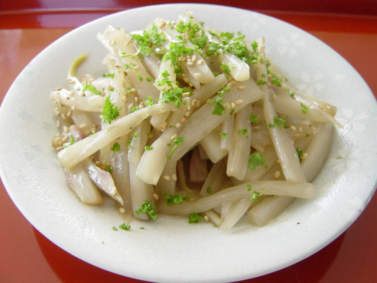 - うどは皮をむき酢水にさらす。拍子切りにし、サラダ油でうどがしんなりするまで炒める。