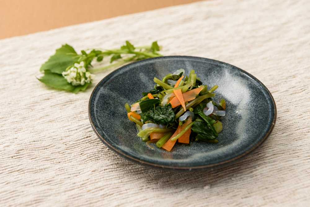 - にんじんは千切りにし、1の刻んだ葉わさびと一緒に熱湯に5秒位入れ、ザルにあげ冷水をさっとかける。