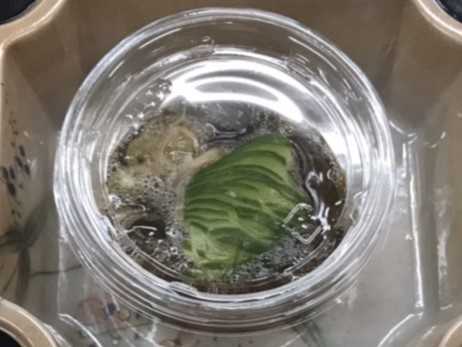 - 色を鮮やかにするために、モズクをザルに入れ熱湯をかける。