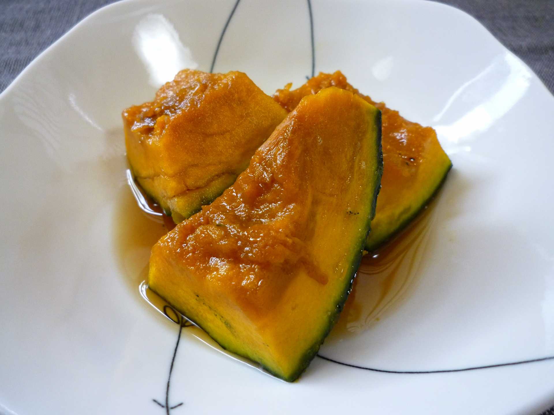 かぼちゃは種を取り、 4cm角に切る。 ところどころ皮をむいて面取りをする。