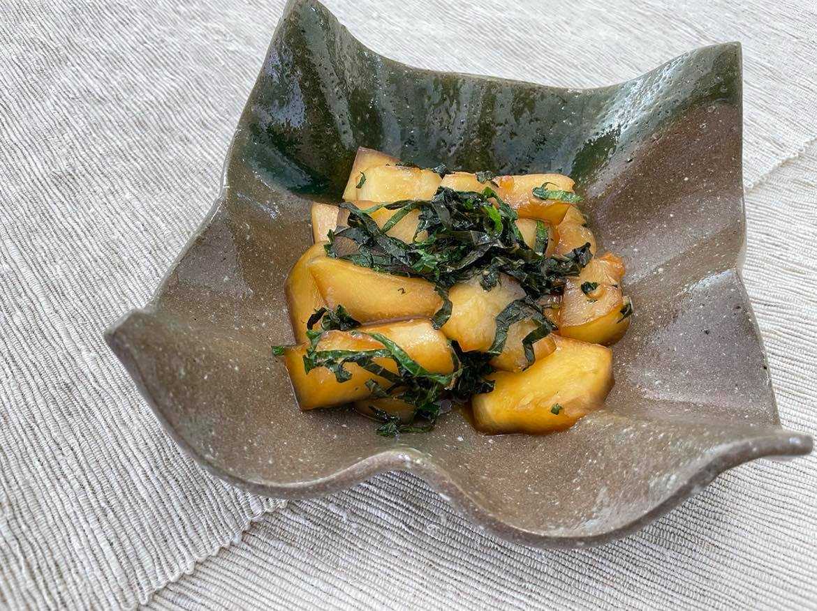 - ゆうがおに味がしみたら、 大葉の千切りを入れて火から下ろし、器に盛る。