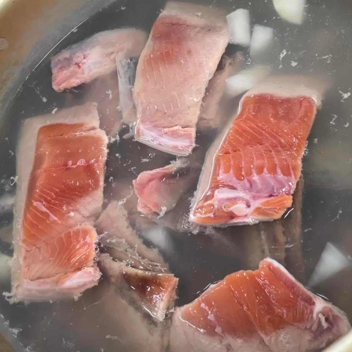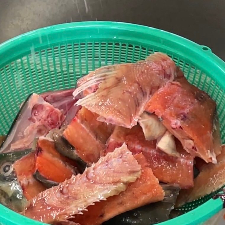 - 鮭の切り身とどんがらは水洗いし、水気を切った後、