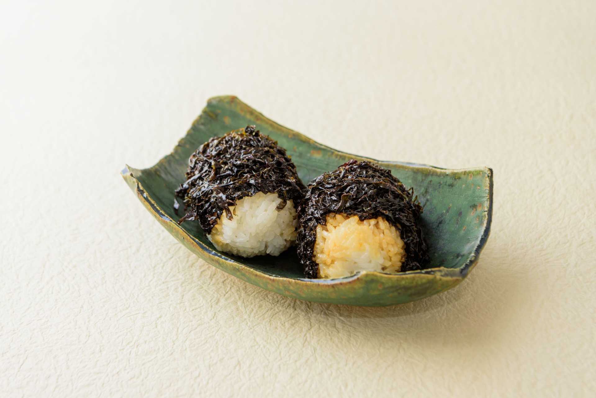 - 握ったおにぎりに、2の岩のりを巻いてできあがり。