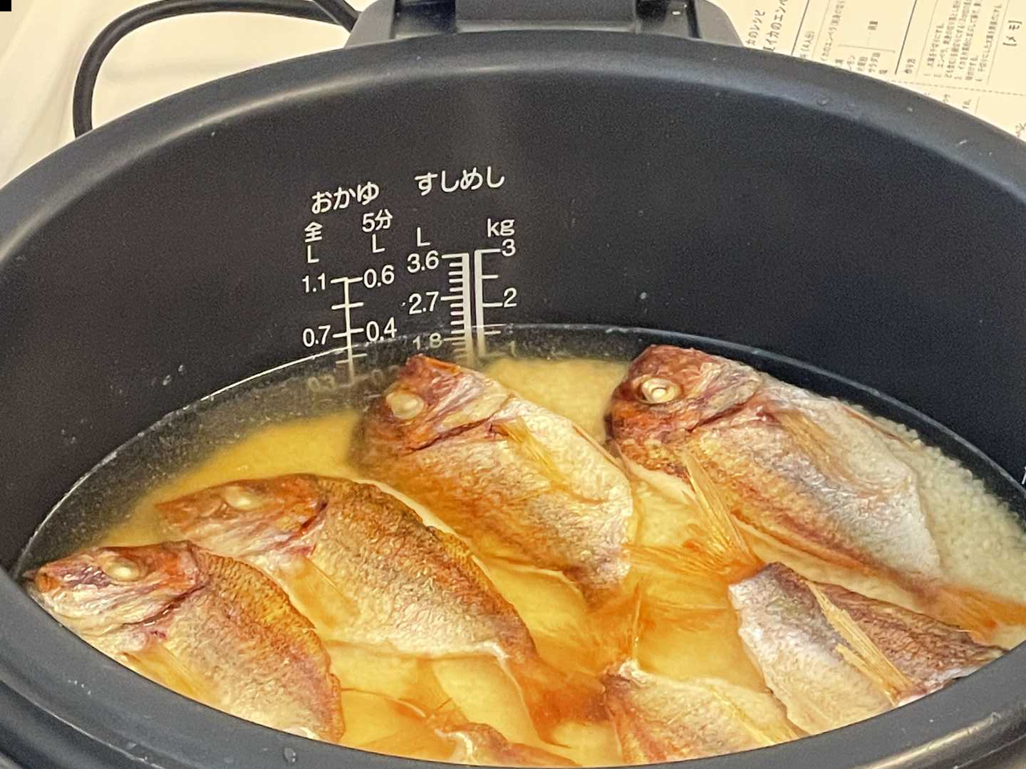 - 炊飯器に1の米2合を入れ、調味料AとBと小鯛を入れ、炊く。