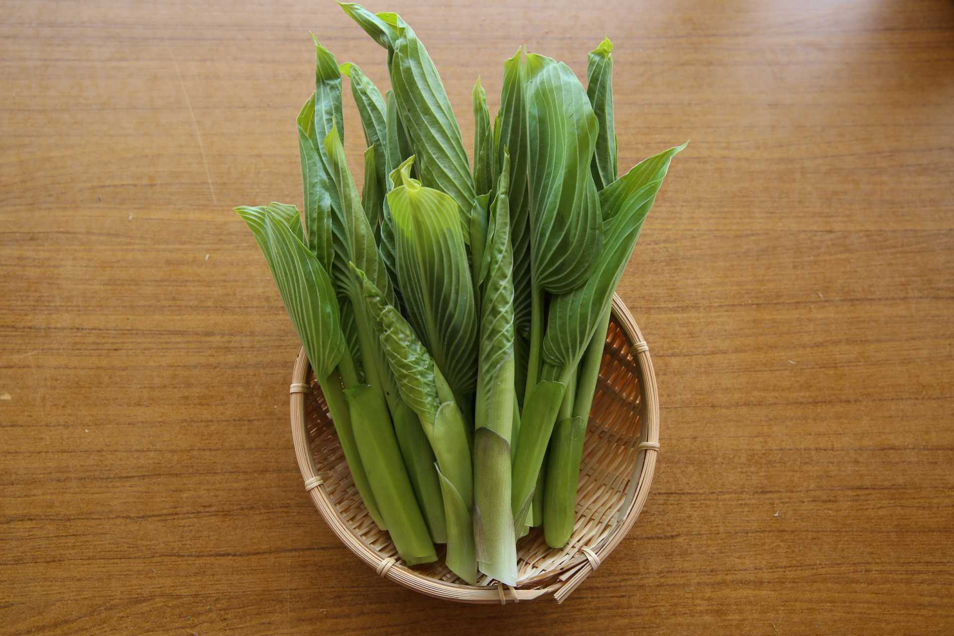 ギボウシの仲間でオオバキボウシ、コバギボウシなど、庄内では総じてうるいと呼びます。古くから各地域で親しまれてきた多年生の山菜で、野生は4月以降、促成栽培のものは1月~3月に出回ります。促成栽培のものはクセがないのに対し、野生のものは苦味がありますが、どちらも独特のぬめりと歯ざわりが特徴です。