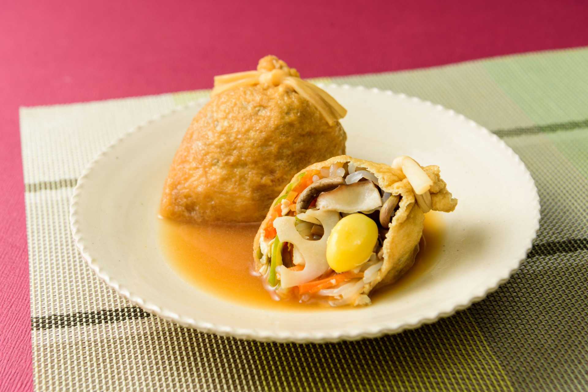 - 1の薄揚げに、 3、4とぎ んなんを詰め、水気をしぼったかんぴょうで切り口を結んできんちゃくを作る。