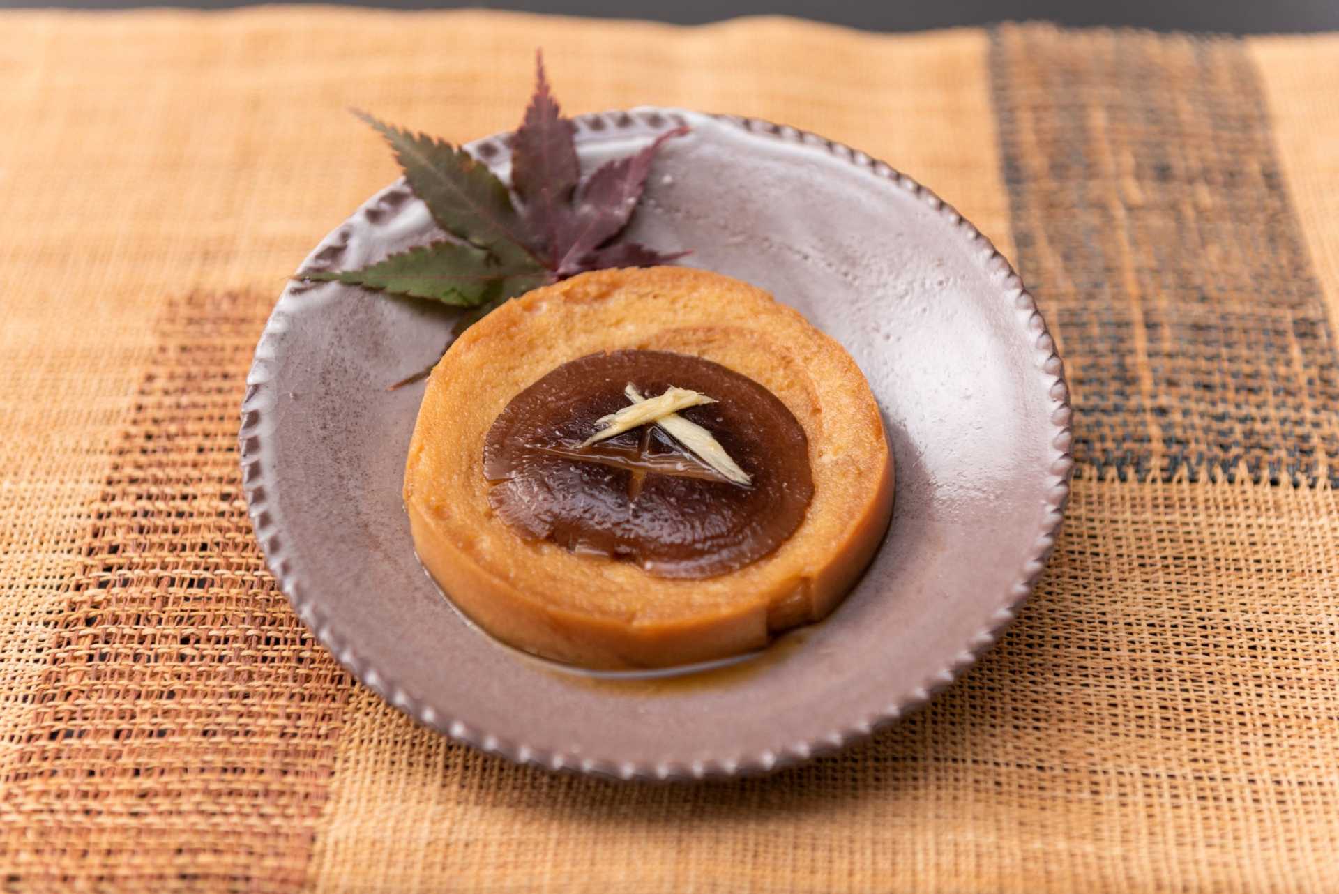 - 麩を三角形になるように半分に折り、 しいたけと一緒に盛り付ける。