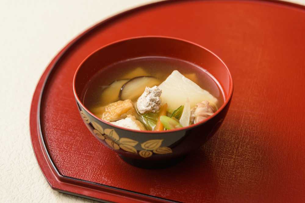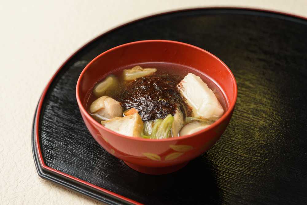 - 最後に4の餅と6の汁をお椀によそい、擦ったくるみまたは、岩のりをのせる。
