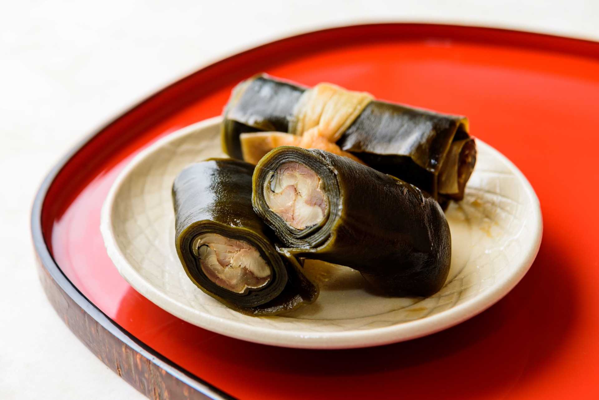 - 水気を拭いた昆布を、練を芯にしてかたく巻き、かんぴょうを2巻きして結ぶ。