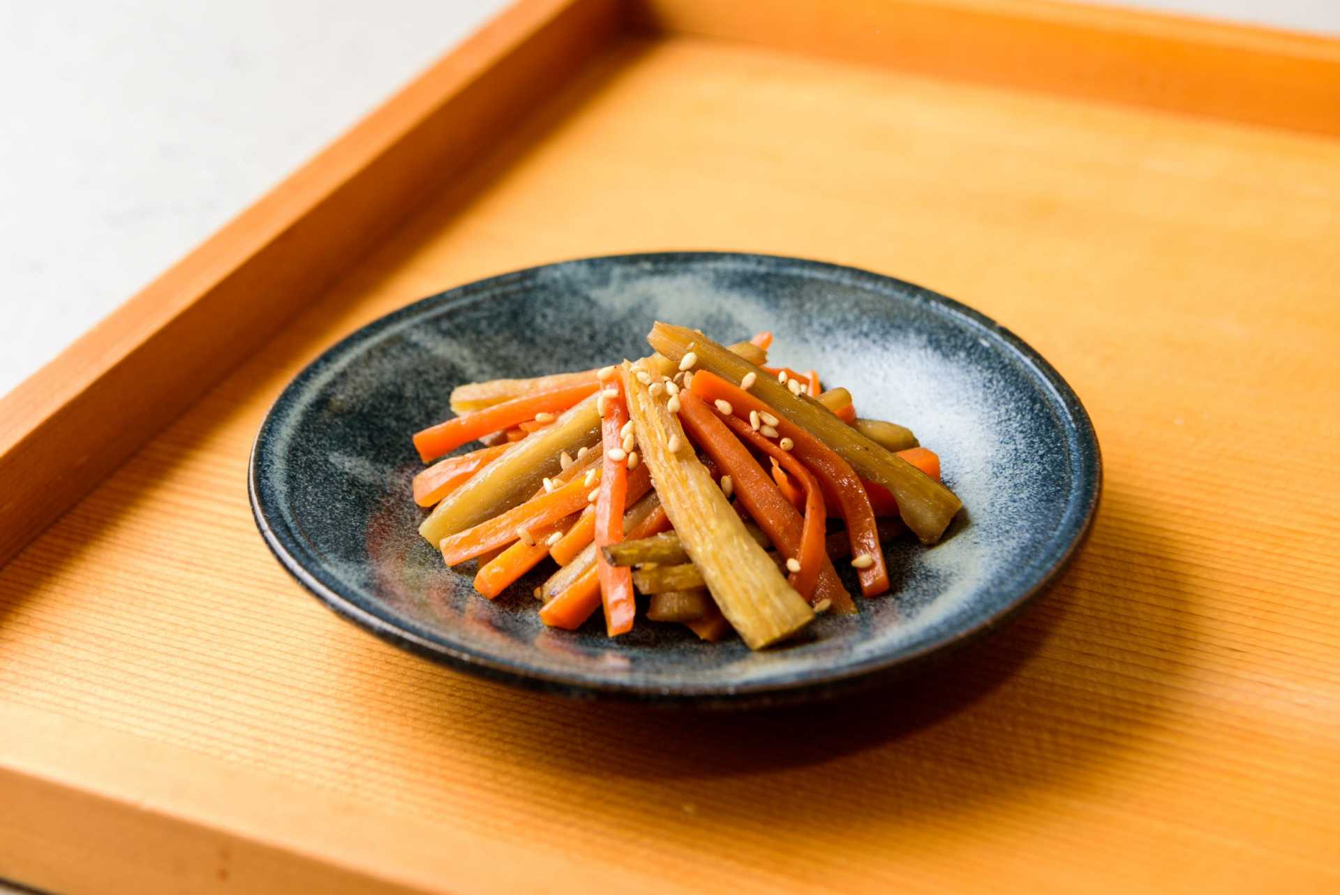 - ごほうをたわしでよくこすって洗い、長さ3~4cmの太めの千切りにしてすぐ酢水にはなし、アク抜きをする。水で洗ってザルにあげ、水気をよくきる。