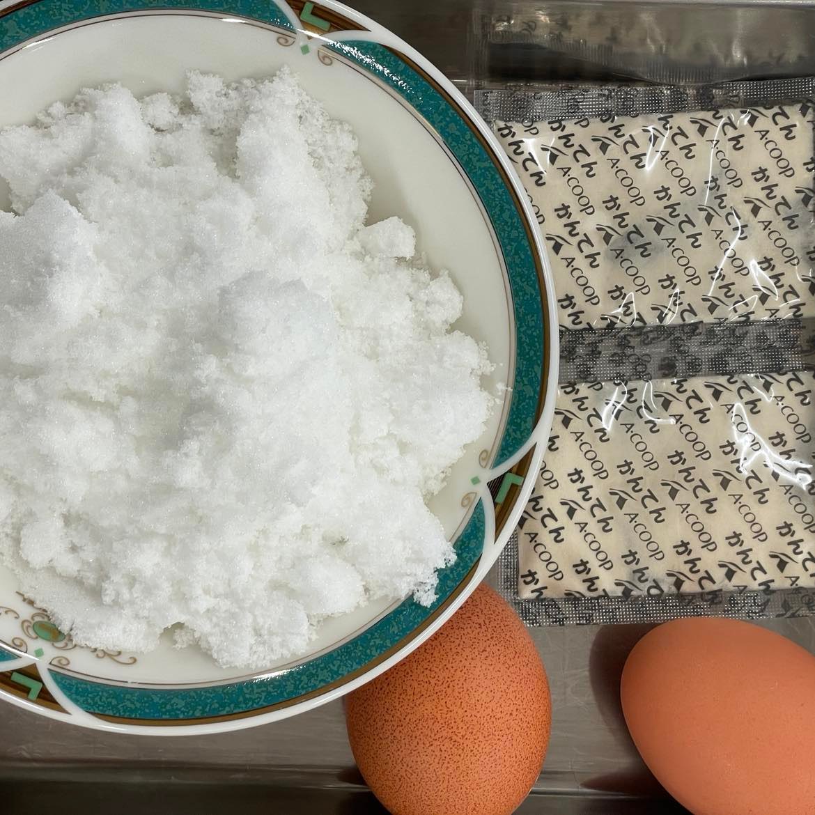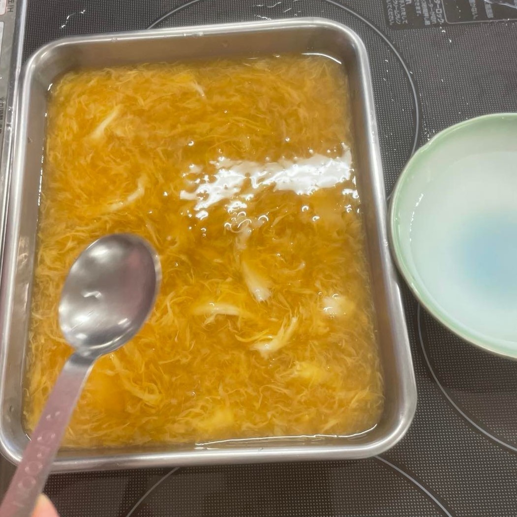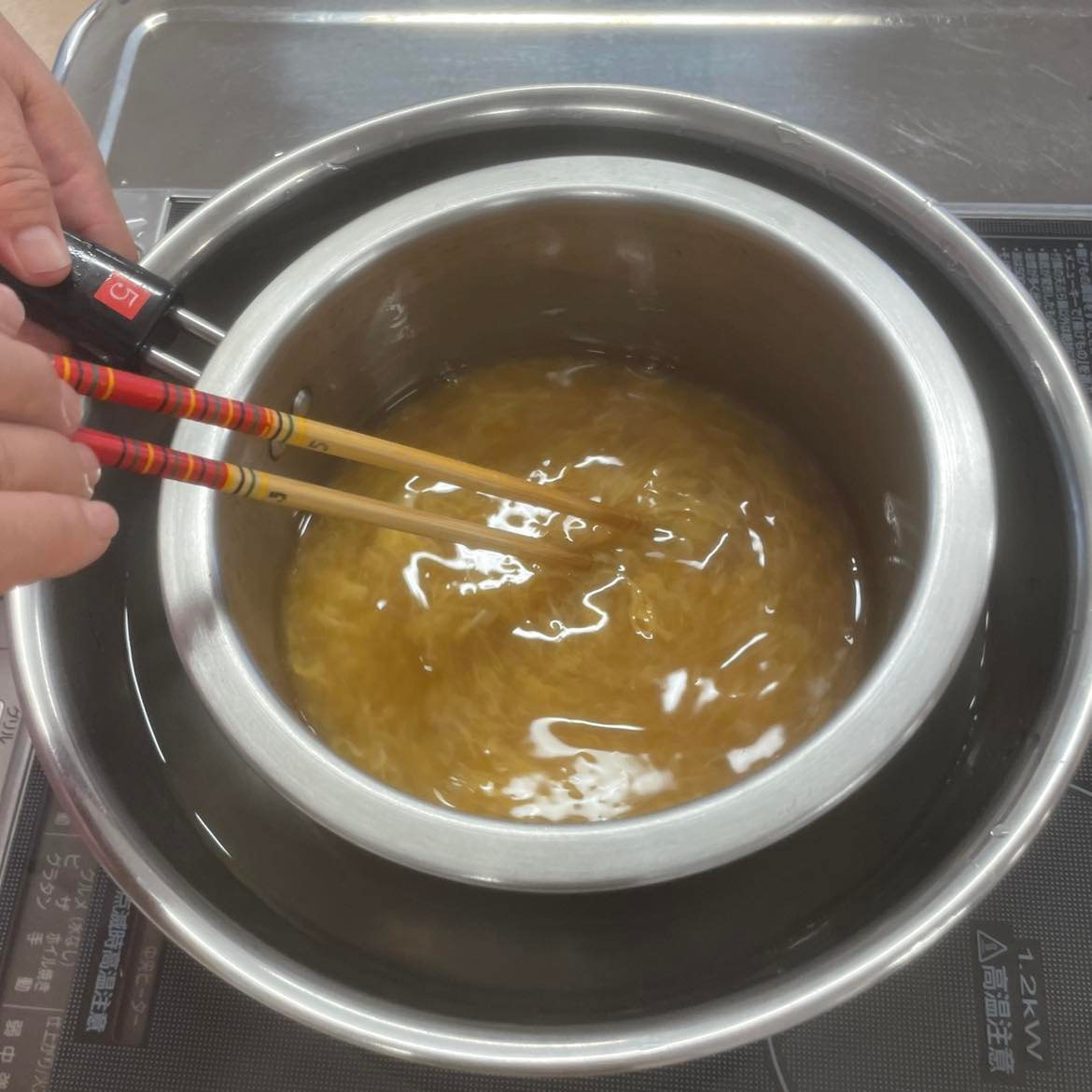 ※卵を溶くときは、菜箸をボウルから離れないようにしてかき混ぜます。また、寒天をかき混ぜるときも鍋から菜箸が離れないようにし、空気を入れないようにします。