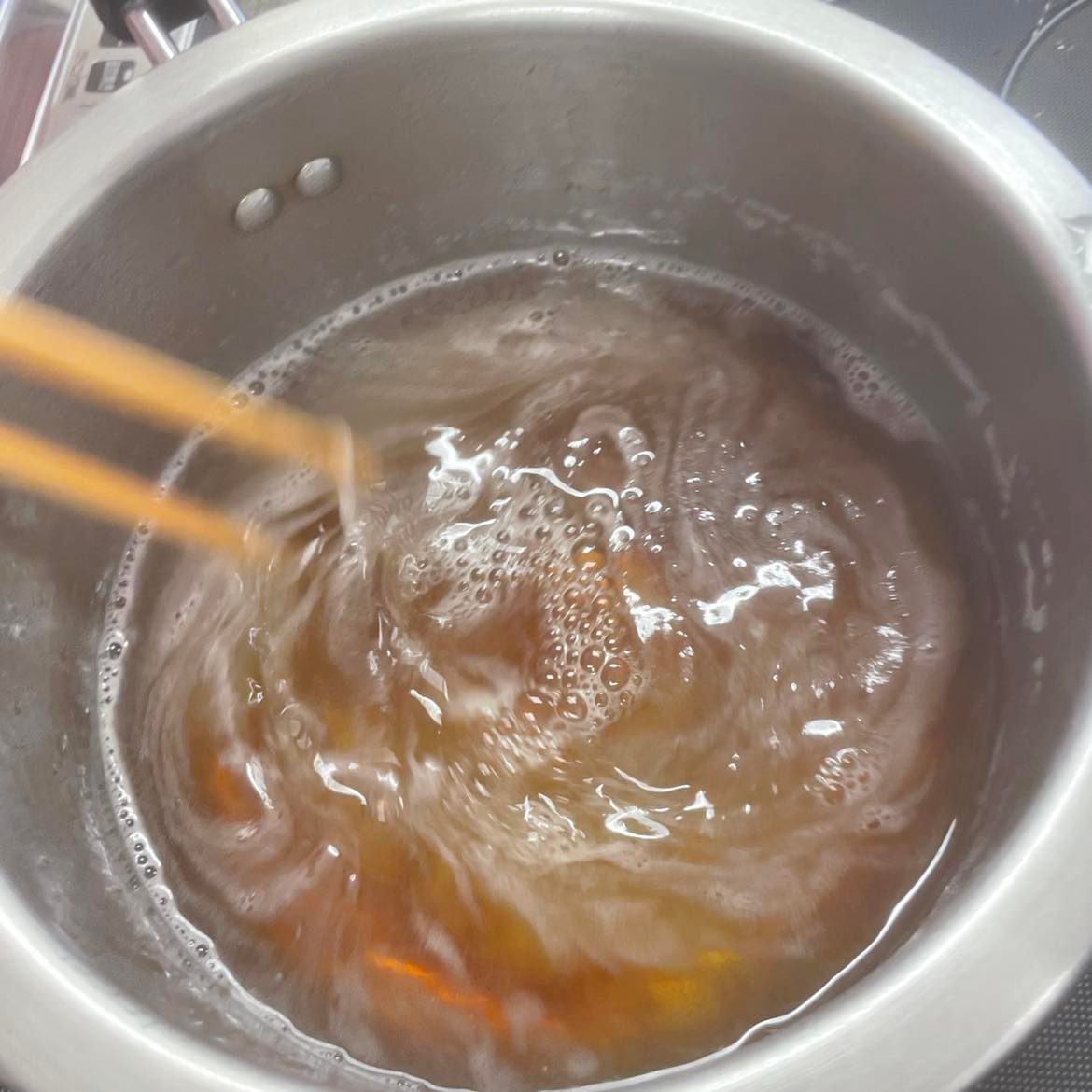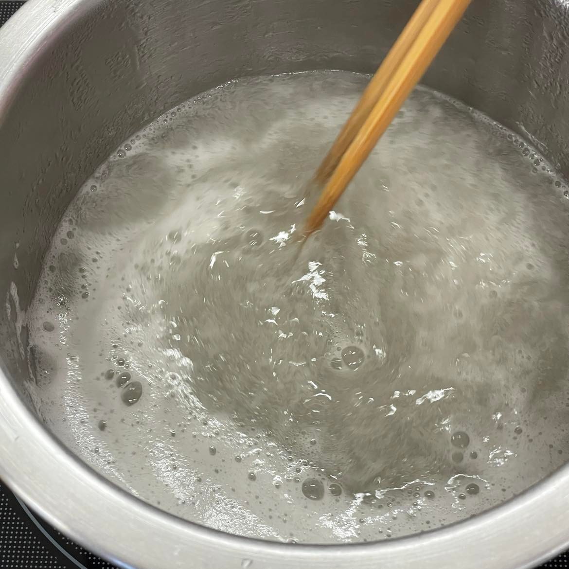 - 沸騰したら砂糖、塩、しょうゆを入れて煮溶かす。 2~3分煮る。