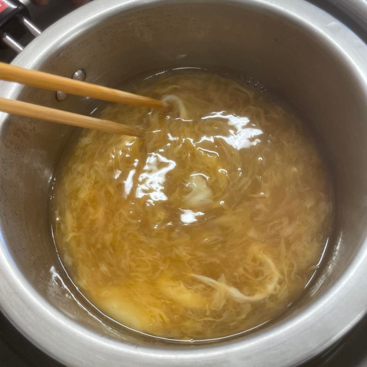 - 溶き卵を一気に入れてかき混ぜて火を止める。