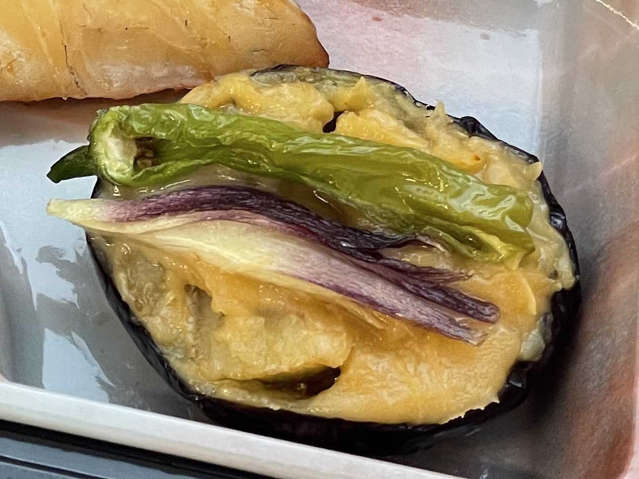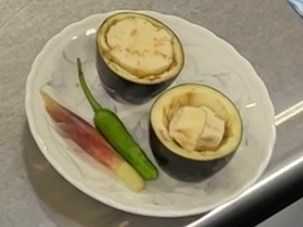 - 揚げた丸なすをくり抜いた場所にもどし、1の練味噌を塗る。