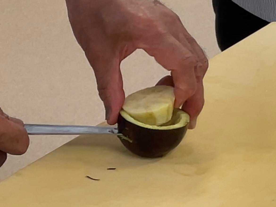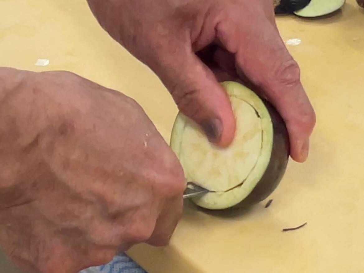 - 1/2にした丸なすの中をくりぬき、器を作る。