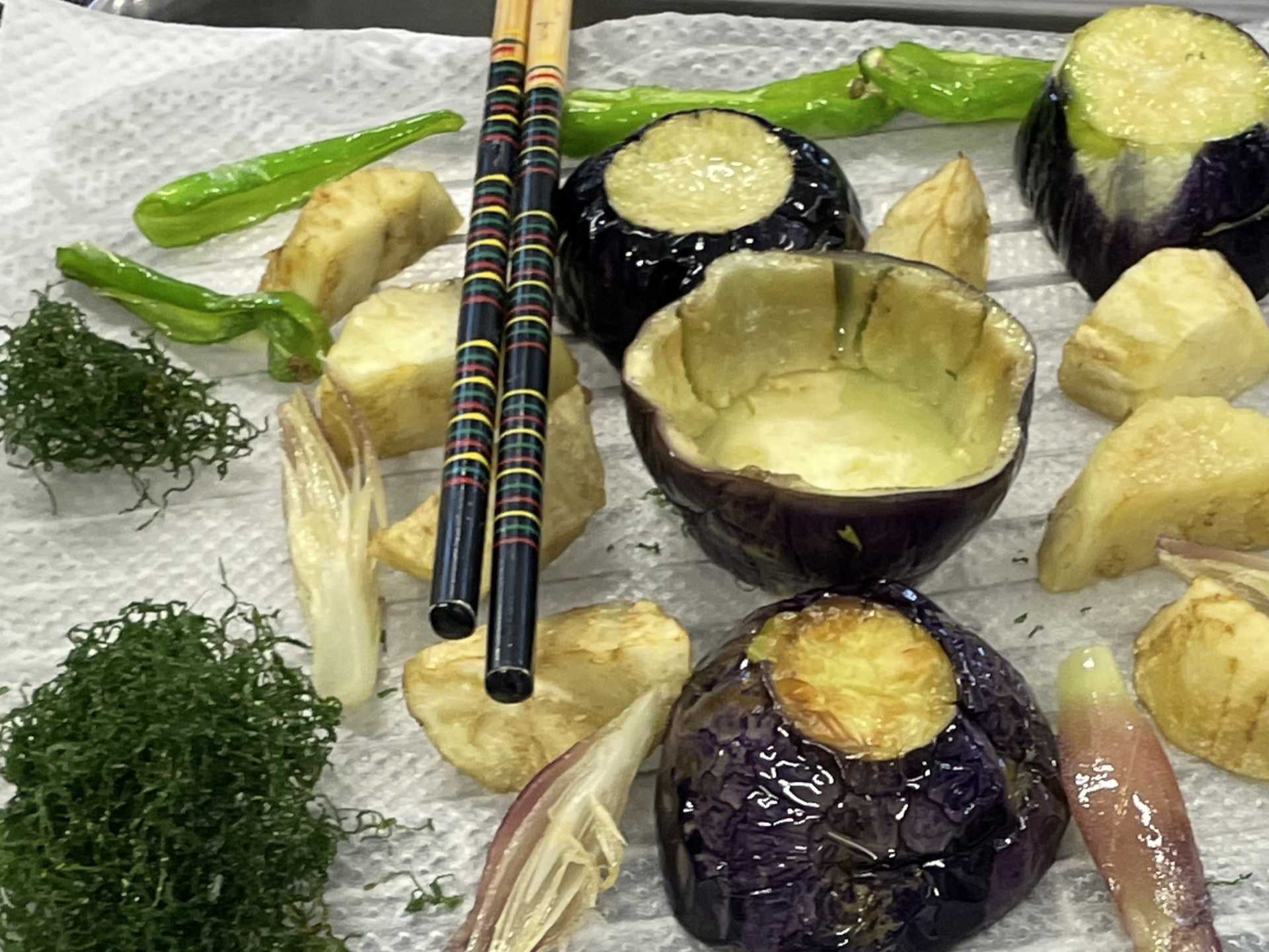 - くり抜いた身と皮、ししとう、みょうがをサラダ油で素揚げする。